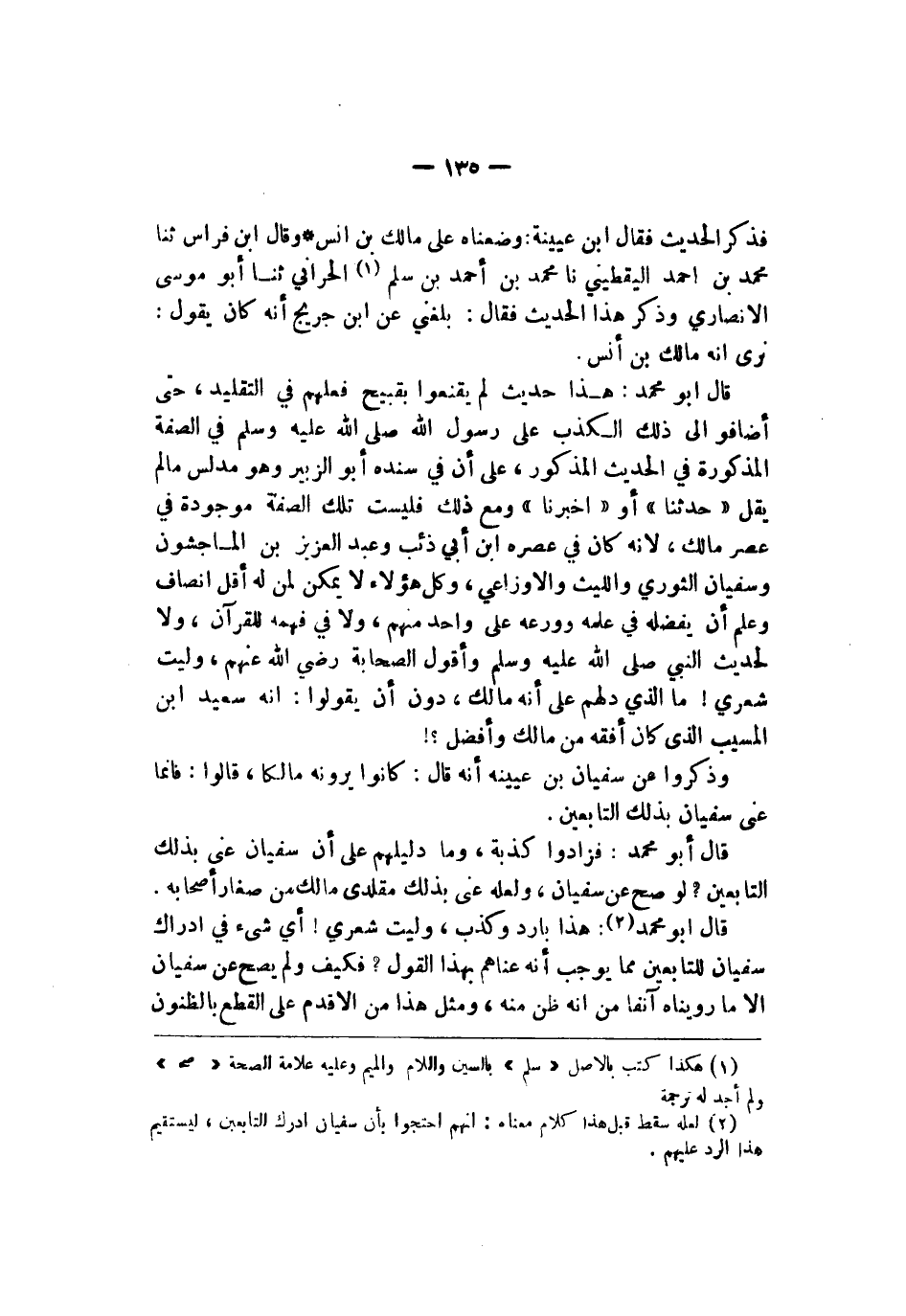 فذكر الحديث فقال ابن عيينة وضعناه على مالك بن أنس قال ابن فراس ثنا محمد بن أحمد اليقطيني نا محمد بن أحمد بن سلم الحراني ثنا أبو موسى الأنصاري وذكر هذا الحديث فقال بلغني عن ابن جريج أنه كان يقول نرى أنه مالك بن أنس قال أبو محمد هذا حديث لم يقنعوا بقبيح فعلهم في التقليد حتى أضافوا إلى ذلك الكذب على رسول الله صلى الله عليه وسلم في الصفة المذكورة في الحديث المذكور على أن في سنده أبو الزبير وهو مدلس ما لم