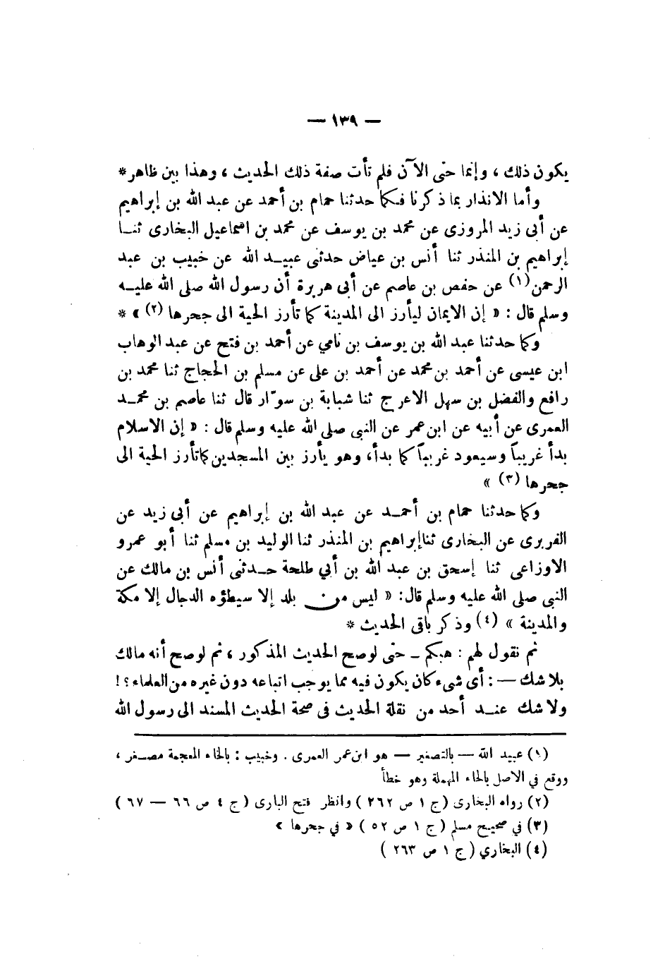 يكون ذلك وإنما حتى الآن فلم تأت صفة ذلك الحديث وهذا بين ظاهر وأما الإنذار بما ذكرنا فكما حدثنا حمام بن أحمد عن عبد الله بن إبراهيم عن أبي زيد المروزي عن محمد بن يوسف عن محمد بن إسماعيل البخاري حدثنا إبراهيم بن المنذر نا أنس بن عياض حدثني عبيد الله عن خبيب بن عبد الرحمن عن حفص بن عاصم عن أبي هريرة أن رسول الله صلى الله عليه وسلم قال إن الإيمان ليأزر إلى المدينة كما تأرز الحية إلى حجرها وكما حدثنا عبد الله بن يوسف بن نامي عن أحمد بن فتح عن عبد الوهاب بن عيسى عن أحمد بن محمد عن أحمد بن علي عن مسلم بن الحجاج ثنا محمد بن رافع والفضل بن سهل الأعرج ثنا شبابة بن سوار قال ثنا عاصم بن محمد العمري عن أبيه عن ابن عمر عن النبي صلى الله عليه وسلم إن الإسلام بدأ غريبا وسيعود غريبا كما بدأ وهو يأرز بين المسجدين كما تأرز الحية إلى جحرها وكما حدثنا حمام بن أحمد عن عبد الله بن إبراهيم عن أبي زيد عن الفربري عن البخاري ثنا إبراهيم بن المنذر ثنا الوليد بن مسلم ثنا أبو عمرو الأوزاعي ثنا إسحاق بن عبد الله بن أبي طلحة حدثني أنس بن مالك عن النبي صلى الله عليه وسلم قال ليس من بلد إلا سيطؤه الدجال إلا مكة والمدينة وذكر باقي الحديث ثم نقول لهم هبكم حتى لو صح الحديث المذكور ثم