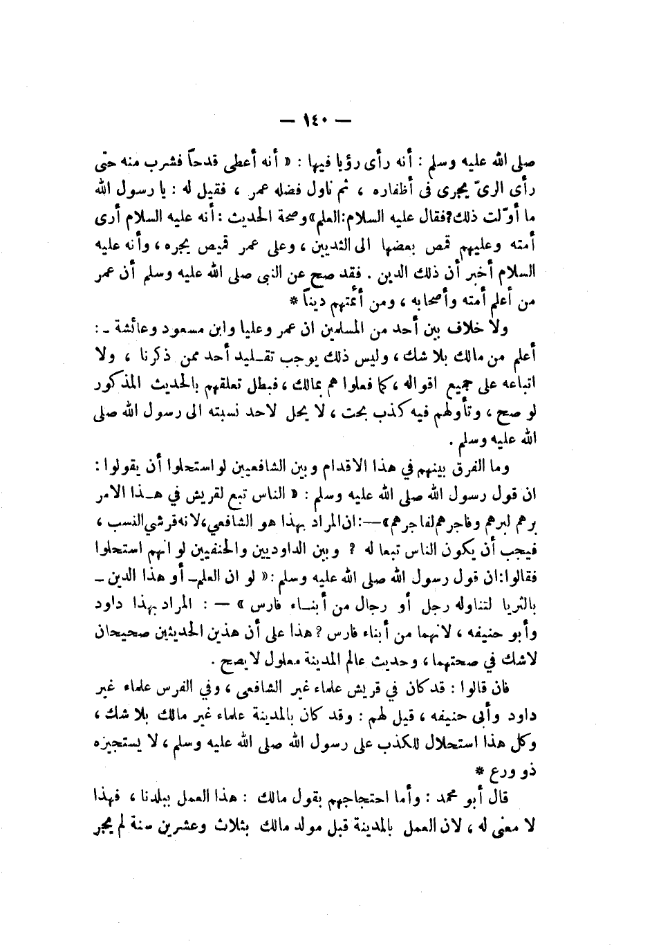 رأى رؤيا فيها أنه أعطي قدحا فشرب منه حتى رأى الري يجري في أظفاره ثم ناول فضله عمر فقيل له يا رسول الله ما أولت ذلك فقال صلى الله عليه وسلم العلم وصحة الحديث أنه صلى الله عليه وسلم أري أمته وعليهم قمص بعضها إلى الثديين وعلى عمر قميص يجره وأنه صلى الله عليه وسلم أخبر أن ذلك الدين فقد صح عن النبي صلى الله عليه وسلم أن عمر من أعلم أمته وأصحابه ومن أئمتهم دينا ولا خلاف بين أحد المسلمين أن عمر وعليا وابن مسعود وعائشة أعلم من مالك بلا شك وليس ذلك يوجب تقليد أحد ممن ذكرنا ولا اتباعه على جميع أقواله كما فعلوا هم بمالك فبطل تعلقهم بالحديث المذكور لو صح وتأولهم فيه كذب بحت لا يحل لأحد نسبته إلى رسول الله صلى الله عليه وسلم وما الفرق بينهم في الإقدام وبين الشافعيين لو استحلوا أن يقولوا إن قول رسول الله صلى الله عليه وسلم الناس تبع لقريش في هذا الأمر برهم لبرهم وفاجرهم لفاجرهم إن المراد بهذا هو الشافعي لأنه قرشي النسب فيجب أن يكون الناس تبعا له وبين الداوديين لو أنهم استحلوا فقال إن قول رسول الله صلى الله عليه وسلم لو أن العلم أو هذا الدين بالثريا لتناوله رجل أو رجال من أبناء فارس المراد بهذا داود وأبو حنيفة لأنهما من أبناء فارس هذا على أن هذين الحديثين صحيحان لا شك في صحتهما وحديث عالم المدينة معلول لا يصح فإن قالوا قد كان في قريش علماء غير الشافعي وفي الفرس علماء غير داود وأبي حنيفة قيل لهم وقد كان بالمدينة علماء غير مالك بلا شك وكان هذا استحلال للكذب على رسول الله صلى الله عليه وسلم لا يستجيزه ذو ورع قال أبو محمد وأما احتجاجهم بقول مالك هذا العمل ببلدنا فهذا لا معنى له لأن العمل بالمدينة قبل مولد مالك بثلاث وعشرين سنة