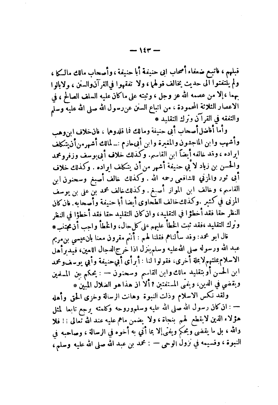 قبلهم فاتبع ضعفاء أصحاب أبي حنيفة أبا حنيفة وأصحاب مالك مالكا ولم يلتفتوا إلى حديث يخالف قولهما ولا تفقهوا في القرآن والسنن ولا بالوا بهما إلا من عصمه الله عز وجل وثبته على ما كان عليه السلف الصالح في الأعصار الثلاثة المحمودة من اتباع السنن عن رسول الله صلى الله عليه وسلم والتفقه في القرآن وترك التقليد وأما أفاضل أصحاب أبي حنيفة ومالك فما قلدوهما فإن خلاف ابن وهب وأشهب وابن الماجشون والمغيرة وابن أبي حازم لمالك أشهر من أن يتكلف إيراده وقد خالفه أيضا