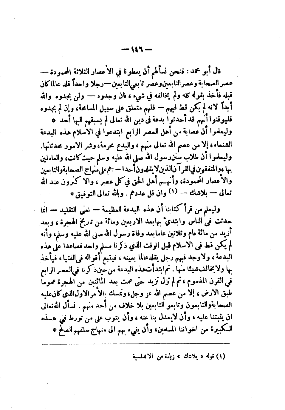 سنن رسول الله صلى الله عليه وسلم حيث كانت والعاملين بها والمتفقهين في القرآن الذين لا يقلدون أحدا هم على منهاج الصحابة والتابعين والأعصار المحمودة وأنهم أهل الحق في كل عصر والأكثرون عند الله تعالى بلا شك وإن قل عددهم وبالله تعالى التوفيق وليعلم من قرأ كتابنا أن هذه البدعة العظيمة نعني التقليد إنما حدثت في الناس وابتدىء بها بعد الأربعين ومائة من تاريخ الهجرة وبعد أزيد من مائة عام وثلاثين عاما بعد وفاة رسول الله صلى الله عليه وسلم وأنه لم يكن قط في الأسلام قبل الوقت الذي ذكرنا مسلم واحد فصاعدا على هذه البدعة ولا وجد فيهم رجل يقلد عالما بعينه فيتبع أقواله في الفتيا فيأخذ بها ولا يخالف شيئا منها ثم ابتدأت هذه البدعة من حين ذكرنا في العصر الرابع في القرن المذموم ثم لم تزل تزيد حتى عمت بعد المائتين من الهجرة عموما طبق الأرض إلا من عصم الله عز وجل وتمسك بالأمر الأول الذي كان عليه الصحابة والتابعون وتابعو التابعين بلا خلاف من أحد منهم نسأل الله تعالى أن يثبتنا عليه وألا يعدل بنا عنه وأن يتوب على من تورط في هذه الكبيرة من إخواننا المسلمين وأن يفيء بهم إلى منهاج سلفهم الصالح