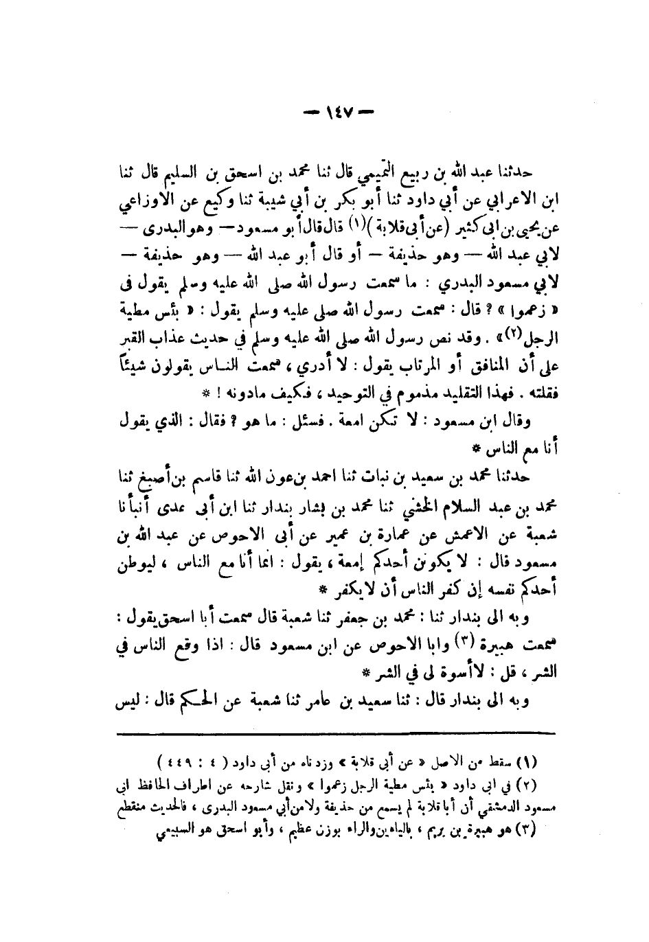 الأعمش عن عمارة بن عمير عن أبي الأحوص عن عبد الله بن مسعود قال لا يكونن أحدكم إمعة يقول إنما أنا مع الناس ليوطن أحدكم نفسه إن كفر الناس ألا يكفر وبه إلى بندار نا محمد بن جعفر نا شعبة قال سمعت أبا إسحاق يقول سمعت هبيرة وأبا الأحوص عن ابن مسعود قال إذا وقع الناس في الشر قل لا أسوة لي في الشر وبه إلى بندار قال ثنا سعيد بن عامر نا شعبة عن الحكم قال ليس