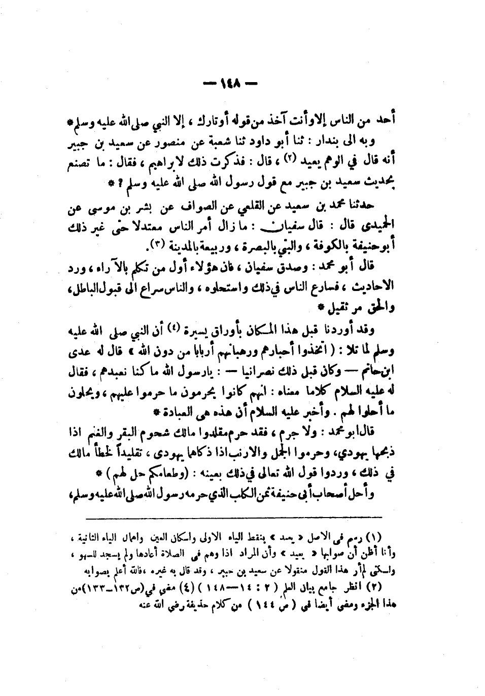 أحد من الناس إلا وأنت آخذ من قوله أو تارك إلا النبي صلى الله عليه وسلم وبه إلى بندار نا أبو داود نا شعبة عن منصور عن سعيد بن جبير أنه قال في الوهم يعيد قال فذكرت ذلك لإبراهيم فقال ما تصنع بحديث سعيد بن جبير مع قول رسول الله صلى الله عليه وسلم حدثنا محمد بن سعيد عن القلعي عن الصواف عن بشر بن موسى عن الحميدي قال قال سفيان ما زال أمر الناس معتدلا حتى غير أبو حنيفة بالكوفة والبتي بالبصرة وربيعة بالمدينة قال أبو محمد وصدق سفيان فإن هؤلاء أول من تكلم بالآراء ورد الأحاديث فسارع الناس في ذلك واستحلوه والناس سراع إلى قبول الباطل والحق مر ثقيل وقد أوردنا قبل هذا المكان بأوراق يسيرة أن النبي صلى الله عليه وسلم لما تلا {تخذوا أحبارهم ورهبانهم أربابا من دون لله ولمسيح بن مريم ومآ أمروا إلا ليعبدوا إلها واحدا لا إله إلا هو سبحانه عما يشركون} قال له عدي بن حاتم وكان قبل ذلك نصرانيا يا رسول الله ما كنا نعبدهم فقال له صلى الله عليه وسلم كلاما معناه إنهم كانوا يحرمون ما حرموا عليهم ويحلون ما أحلوا لهم وأخبر صلى الله عليه وسلم أن هذه هي العبادة قال أبو محمد ولا جرم فقد حرم مقلدو مالك شحوم البقر والغنم إذا ذبحها يهودي وحرموا الجمل والأرنب إذا ذكاهما يهودي تقليدا لخطأ مالك في ذلك وردوا قول الله تعالى في ذلك بعينه {ليوم أحل لكم لطيبات وطعام لذين أوتوا لكتاب حل لكم وطعامكم حل لهم ولمحصنات من لمؤمنات ولمحصنات من لذين أوتوا لكتاب من قبلكم إذآ