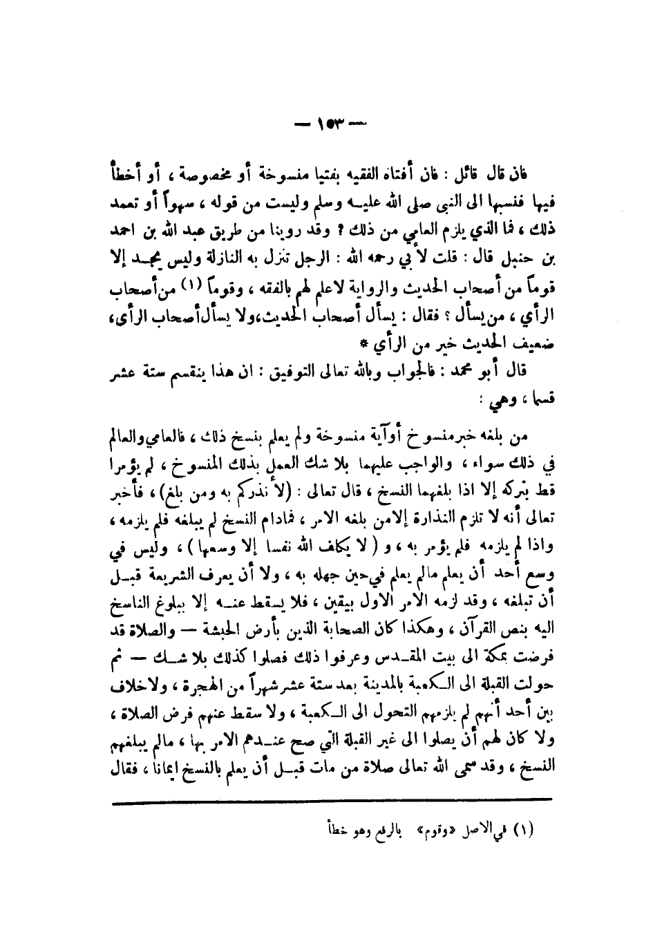 فإن قال قائل فإن أفتاه الفقيه بفتيا منسوخة أو مخصوصة أو أخطأ فيها فنسبها إلى النبي صلى الله عليه وسلم وليست من قوله سهوا أو تعمد ذلك فما الذي يلزم العامي من ذلك وقد روينا من طريق عبد الله بن أحمد بن حنبل قال قلت لأبي رحمه الله الرجل تنزل به النازلة وليس يجد إلا قوما من أصحاب الحديث والرواية لا علم لهم بالفقه وقوما من أصحاب الرأي من يسأل فقال يسأل أصحاب الحديث ولا يسأل أصحاب الرأي ضعيف الحديث خير من الرأي قال أبو محمد فالجواب وبالله تعالى التوفيق إن هذا ينقسم ستة