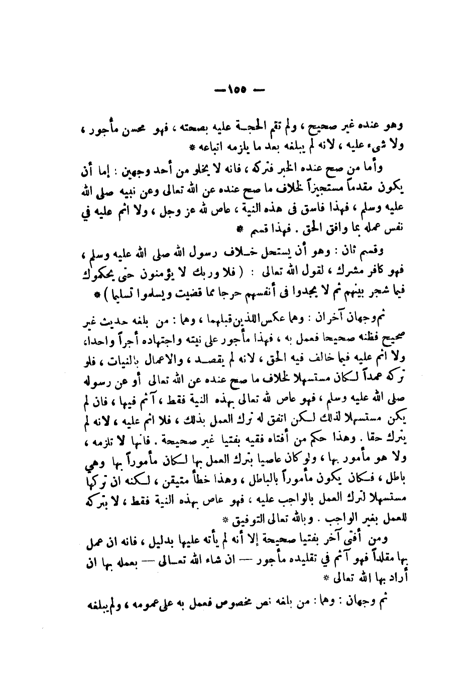 وهو عنده غير صحيح ولم تقم الحجة عليه بصحته فهو محسن مأجور ولا شيء عليه لأنه لم يبلغه بعد ما يلزمه اتباعه وأما من صح عنده الخبر فتركه فإنه لا يخلو من أحد وجهين إما أن يكون مقدما مستجيزا لخلاف ما صح عنده من الله عز وجل ولا إثم عليه في نفس عمله بما وافق الحق فهذا قسم وقسم ثان وهو أن يستحل خلاف رسول الله صلى الله عليه وسلم فهو كافر مشرك لقول الله تعالى {فلا وربك لا يؤمنون حتى يحكموك فيما شجر بينهم ثم لا يجدوا في أنفسهم حرجا مما قضيت ويسلموا تسليما} ثم وجهان آخران وهما عكس اللذين قبلهما وهما من بلغه حديث غير صحيح فظنه صحيحا فعمل به فهذا مأجور على نيته واجتهاده أجرا واحدا ولا إثم عليه فيما خالف فيه الحق لأنه لم يقصد والأعمال بالنيات فلو تركه عمدا لكان متسهلا لخلاف ما صح عنده عن الله تعالى أو عن رسوله صلى الله عليه وسلم فهو عاص لله تعالى بهذه النية فقط آثما فيها فإن لم يكن مستسهلا لذلك لكن اتفق له ترك العمل بذلك فلا إثم عليه لأنه لم يترك حقا وهذا حكم من أفتاه فقيه بفتيا غير صحيحة فإنها لا تلزمه ولا هو مأمور بها ولو كان عاصيا بترك العمل بها لكان مأمورا بها وهي باطل فكان يكون مأمورا بالباطل وهذا خطأ متيقن لكنه إن تركها مستسهلا لترك العمل