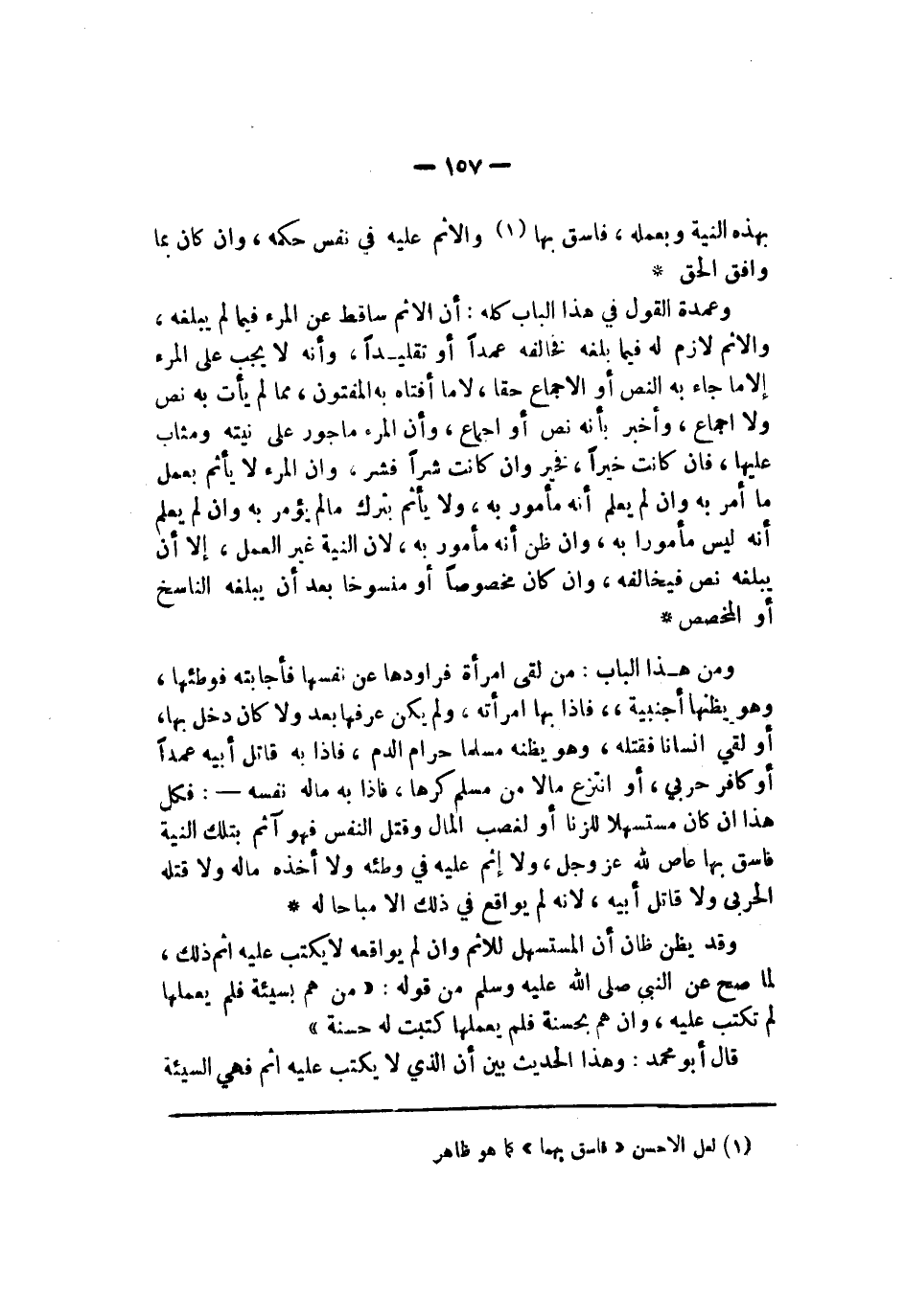 بهذه النية وبعمله فاسق بها والإثم عليه في نفس حكمه وإن كان بما وافق الحق وعمدة القول في هذا الباب كله أن الإثم ساقط عن المرء فيما لم يبلغه والإثم لازم له فيما بلغه فخالفه عمدا أو تقليدا وأنه لا يجب على المرء إلا ما جاء به النص أو الإجماع حقا لا ما أفتاه به المفتون مما لم يأت به نص ولا إجماع وأخبر بأنه نص أو إجماع وأنه مأجور على نيته ومثاب عليها فإن كانت خيرا فخير وإن كانت شرا فشر وإن المرء لا يأثم بعمل ما أمر به وإن لم يعلم أنه مأمور به ولا يأثم بترك ما لم يؤمر به وإن لم يعلم أنه ليس مأمورا به وإن ظن أنه مأمور به لأن النية غير العمل إلا أن يبلغه نص فيخالفه وإن كان مخصوصا أو منسوخا بعد أن يبلغه الناسخ أو المخصص ومن هذا الباب من لقي امرأة فراودها عن نفسها فأجابته فوطئها وهو يظنها أجنبية فإذا بها امرأته ولم يكن عرفها بعد ولا كان دخل بها أو لقي إنسانا فقتله وهو يظنه مسلما حرام الدم فإذا به قاتل أبيه عمدا أو كافر حربي أو انتزاع مالا من مسلم كرها فإذا به ماله نفسه فكل هذا إن كان مستسهلا للزنى أو لغصب المال وقتل النفس فهو آثم بتلك النية فاسق بها عاص لله عز وجل ولا إثم عليه في وطئه ولا أخذه ماله ولا قتله الحربي ولا قاتل أبيه لأنه لم يواقع في ذلك إلا مباحا له وقد يظن ظان أن المستسهل للإثم وإن لم يواقعه لا يكتب عليه إثم ذلك لما صح عن النبي صلى الله عليه وسلم من قوله من هم بسيئة فلم يعملها لم تكتب عليه ومن هم بحسنة فلم يعملها كتبت له حسنة قال أبو محمد وهذا الحديث بين أن الذي لا يكتب عليه إثم فهي السيئة
