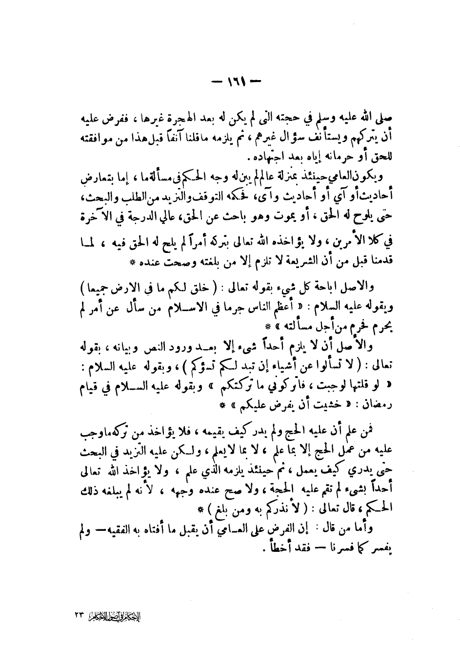 صلى الله عليه وسلم في حجته التي لم يكن له بعد الهجرة غيرها ففرض عليه أن يتركهم ويستأنف سؤال غيرهم ثم يلزمه ما قلنا آنفا قبل هذا من موافقته للحق أو حرمانه إياه بعد اجتهاده ويكون العامي حينئذ بمنزلة عالم لم يبين له وجه الحكم في مسألة ما إما بتعارض أحاديث أو آي أو أحاديث وآي فحكمه التوقف والتزيد من الطلب والبحث حتى يلوح له الحق أو يموت وهو باحث عن الحق عالي الدرجة في