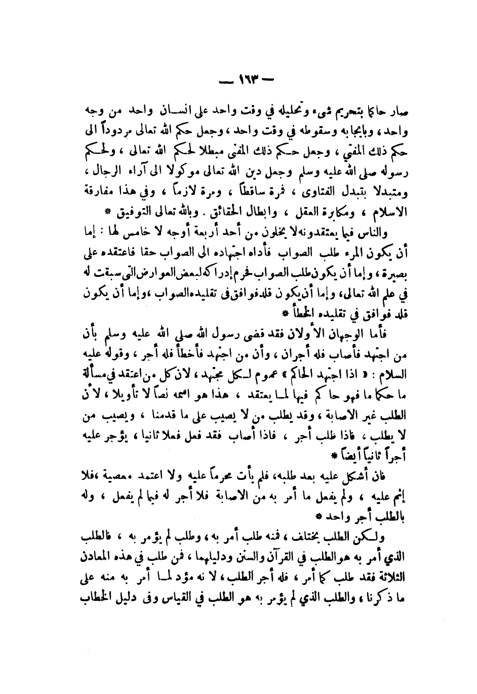 صار حاكما بتحريم شيء وتحليله في وقت واحد وجعل حكم الله تعالى مردودا إلى حكم ذلك المفتي وجعل حكم ذلك المفتي مبطلا لحكم الله تعالى ولحكم رسوله صلى الله عليه وسلم وجعل دين الله تعالى موكولا إلى آراء الرجال ومتبدلا بتبدل الفتاوى فمرة ساقطا ومرة لازما وفي هذا مفارقة الإسلام ومكابرة العقل وإبطال الحقائق وبالله تعالى التوفيق والناس فيما يعتقدونه ولا يخلون من أحد أربعة أوجه لا خامس لها إما أن يكون المرء طلب الصواب فأداه اجتهاده إلى الصواب حقا فاعتقده على بصيرة وإما أن يكون طلب الصواب فحرم إدراكه لبعض العوارض التي سبقت له في علم الله تعالى وإما أن يكون قلد فوافق في تقليده الصواب وإما أن يكون قلد فوافق في تقليده الخطأ فأما الوجهان الأولان فقد قضى رسول الله صلى الله عليه وسلم بأن من اجتهد فأصاب فله أجران وأن من اجتهد فأخطأ فله أجر وقوله صلى الله عليه وسلم إذا اجتهد الحاكم عموم لكل مجتهد لأن كل من اعتقد في مسألة ما حكما ما فهو حاكم فيها لما يعتقد هذا هو اسمه نصا لا تأويلا لأن الطلب غير الإصابة وقد يطلب من لا يصيب على ما قدمنا ويصيب من لا يطلب فإذا طلب أجر فإذا أصاب فقد فعل فعلا ثانيا يؤجر عليه أجرا ثانيا أيضا فإن أشكل عليه بعد طلبه فلم يأت محرما عليه ولا اعتمد معصية فلا إثم عليه ولم يفعل ما أمر به من الإصابة فلا أجر له فيما لم يفعل وله بالطلب أجر