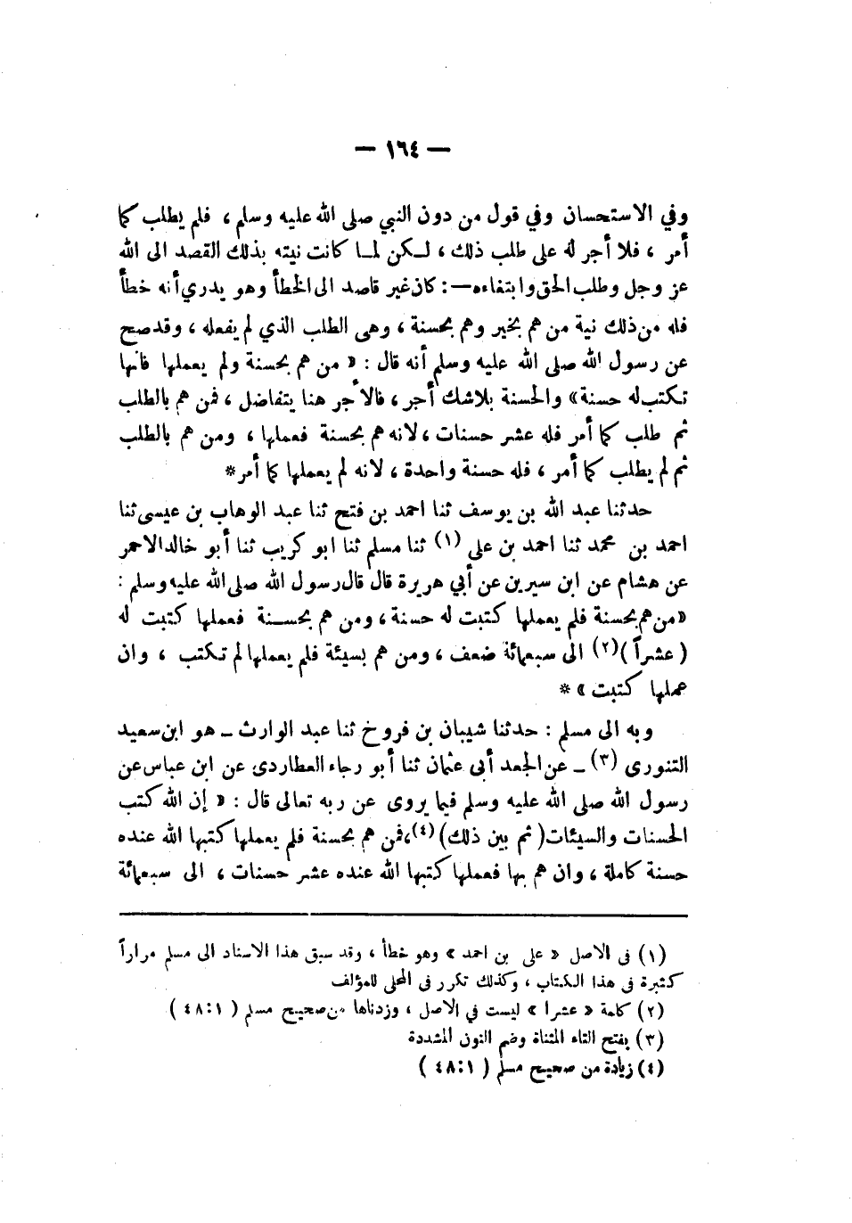 وفي الاستحسان وفي قول من دون النبي صلى الله عليه وسلم فلم يطلب كما أمر فلا أجر له على طلب ذلك لكن لما كانت نيته بذلك القصد إلى الله عز وجل وطلب الحق وابتغاءه كان غير قاصد إلى الخطأ وهو يدري أنه خطأ فله من ذلك نية من هم بخير وهم بحسنة وهي الطلب الذي لم يفعله وقد صح عن رسول الله صلى الله عليه وسلم أنه قال من هم بحسنة ولم يعملها فإنها تكتب له حسنة والحسنة بلا شك أجر فالأجر هنا يتفاضل فمن هم بالطلب ثم طلب كما أمر فله عشر حسنات لأنه هم بحسنة فعملها ومن هم بالطلب كما أمر فله حسنة واحدة لأنه لم يعملها كما أمر حدثنا عبد الله بن يوسف ثنا أحمد بن فتح ثنا عبد الوهاب بن عيسى ثنا أحمد بن محمد ثنا أحمد بن علي ثنا مسلم ثنا أبو كريب ثنا أبو خالد الأحمر عن هشام عن ابن سيرين عن أبي هريرة قال قال رسول الله صلى الله عليه وسلم من هم بحسنة فلم يعملها كتبت له حسنة ومن هم بحسنة فعملها كتبت له عشرا إلى سبعمائة ضعف ومن هم بسيئة فلم يعملها لم تكتب وإن عملها كتبت وبه إلى مسلم حدثنا شيبان بن فروخ ثنا عبد الوارث هو ابن سعيد التنوري عن الجعد أبي عثمان ثنا أبو رجاء العطاري عن ابن عباس عن رسول الله صلى الله عليه وسلم فيما يروي عن ربه تعالى قال إن الله كتب الحسنات والسيئات ثم بين ذلك فمن هم بحسنة فلم يعملها كتبها الله عنده حسنة كاملة وإن هم بها فعملها كتبها الله عنده عشر حسنات إلى سبعمائة