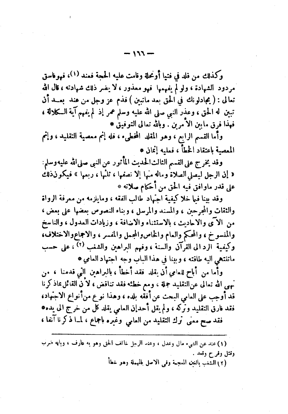 وكذلك من قلد في فتيا أو نحلة وقامت عليه الحجة فعند فهو فاسق مردود الشهادة ولو لم يفهمها فهو معذور ولا يضر ذلك شهادته قال الله تعالى {يجادلونك في لحق بعدما تبين كأنما يساقون إلى لموت وهم ينظرون} فذم عز وجل من عند بعد أن تبين له الحق وعذر النبي صلى الله عليه وسلم عمر إذ لم يفهم آية الكلالة فهذا فرق ما بين الأمرين وبالله تعالى التوفيق وأما القسم الرابع وهو المقلد المخطىء فله إثم معصية التقليد وإثم المعصية باعتقاده الخطأ فعليه إثمان وقد يخرج على القسم الثالث الحديث المأثور عن النبي صلى الله عليه وسلم إن الرجل ليصلي الصلاة وما له منها إلا نصفها ثلثها ربعها فيكون ذلك على قدر ما وافق فيه الحق من أحكام صلاته وقد بينا فيما خلا كيفية اجتهاد طالب الفقه وما يلزمه من معرفة الرواة والثقات والمجرحين والمسند المرسل وبناء النصوص بعضها على بعض من الآي والأحاديث والاستثناء والإضافة وزيادات