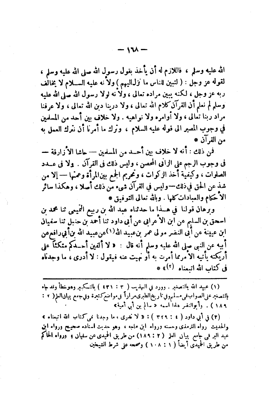 يأخذ بقول رسول الله صلى الله عليه وسلم لقوله عز وجل {بلبينات ولزبر وأنزلنا إليك لذكر لتبين للناس ما نزل إليهم ولعلهم يتفكرون} ولأنه صلى الله عليه وسلم لا يخالف ربه عز وجل لكنه يبين مراده تعالى ولأنه لولا رسول الله صلى الله عليه وسلم لم نعلم أن القرآن كلام الله تعالى ولا درينا دين الله تعالى ولا عرفنا مراد ربنا تعالى ولا أوامره ولا نواهيه ولا خلاف بين أحد المسلمين في وجوب المصير إلى قوله صلى الله عليه وسلم وترك ما أمرنا أن نترك العمل به من القرآن فمن ذلك أنه لا خلاف بين أحد من المسلمين حاشا الأزارقة في وجوب الرجم على الزاني المحصن وليس ذلك في القرآن ولا في عدد الصلوات وكيفية أخذ الزكوات وتحريم الجمع بين المرأة وعمتها إلا من شذ عن الحق في ذلك وليس في القرآن شيء من ذلك أصلا وهكذا سائر الأحكام والعبادات كلها وبالله تعالى التوفيق وبرهان قولنا في هذا ما حدثناه عبد الله بن ربيع التميمي ثنا محمد بن إسحاق بن السليم عن أبي داود نا أحمد بن حنبل نا سفيان بن عيينة عن أبي النضر مولى عمر بن عبيد الله عن عبيد الله بن أبي رافع عن أبيه عن النبي صلى الله عليه وسلم أنه قال لا ألفين أحدكم متكئا على أريكته يأتيه الأمر بما أمرت به أو نهيت عنه فيقول لا أدري ما وجدناه في كتاب الله تبعناه