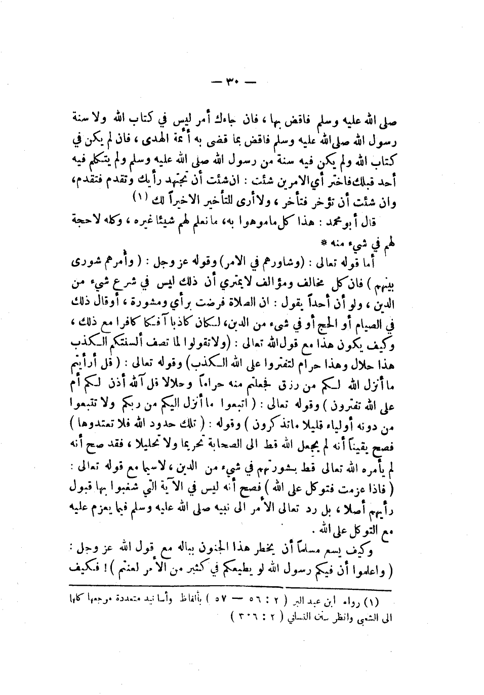 صلى الله عليه وسلم فاقض بها فإن جاءك أمر ليس في كتاب الله ولا سنة رسول الله صلى الله عليه وسلم فاقض بما قضى به أئمة الهدى فإن لم يكن في كتاب الله ولم يكن فيه سنة من رسول الله صلى الله عليه وسلم ولم يتكلم فيه أحد قبلك فاختر أي الأمرين شئت إن شئت أن تجتهد رأيك وتقدم فتقدم وإن شئت أن تؤخر فتأخر ولا أرى التأخير إلا خيرا لك قال أبو محمد هذا كل ما موهوا به ما نعلم لهم شيئا غيره وكله لا حجة لهم في شيء منه أما قوله تعالى {فبما رحمة من لله لنت لهم ولو كنت فظا غليظ لقلب لانفضوا من حولك فعف عنهم وستغفر لهم وشاورهم في لأمر فإذا عزمت فتوكل على لله إن لله يحب لمتوكلين} وقوله عز وجل {ولذين ستجابوا لربهم وأقاموا لصلاة وأمرهم شورى بينهم ومما رزقناهم ينفقون} فإن كل مخالف ومؤلف لا يمتري أن ذلك ليس في شرع شيء من الدين ولو أن أحدا يقول