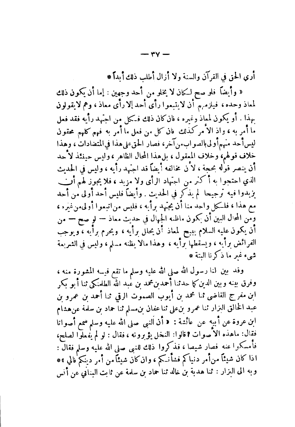 أرى الحق في القرآن والسنة ولا أزال أطلب ذلك أبدا وأيضا فلو صح لكان لا يخلو من أحد وجهين إما أن يكون ذلك لمعاذ وحده فيلزمهم ألا يتبعوا رأي أحد إلا رأي معاذ وهم لا يقولون بهذا أو يكون لمعاذ وغيره فإن كان ذلك فكل من اجتهد رأيه فقد فعل ما أمر به وإذ الأمر كذلك فإن كل من فعل ما أمر به فهم كلهم محقون ليس أحد منهم أولى بالصواب من آخر فصار الحق على هذا في المتضادات وهذا خلاف قولهم وخلاف المعقول بل هذا المحال الظاهر وليس حينئذ لأحد أن ينصر قوله بحجة لأن مخالفه أيضا قد اجتهد رأيه وليس في الحديث الذي احتجوا به أكثر من اجتهاد الرأي ولا مزيد فلا يجوز لهم أن يزيدوا فيه ترجيحا لم يذكر في الحديث وأيضا فليس أحد أولى من أحد مع هذا فلكل واحد منا أن يجتهد برأيه فليس من اتبعوا أولى من غيره ومن المحال البين أن يكون ما ظنه الجهال في حديث معاذ لو صح من أن يكون صلى الله عليه وسلم يبيح لمعاذ أن يحلل برأيه ويحرم برأيه ويوجب الفرائض برأيه ويسقطها برأيه وهذا ما لا يظنه مسلم وليس في الشريعة شيء غير ما ذكرنا البتة وقد بين لنا رسول الله صلى الله عليه وسلم ما تقع فيه المشورة منه وفرق بينه وبين الدين كما حدثنا أحمد بن محمد بن عبد الله الطلمنكي نا أبو بكر بن مفرج القاضي نا محمد بن أيوب الصموت الرقي نا أحمد بن عمرو بن عبد الخالق البزار نا عمرو بن علي نا عفان بن مسلم نا حماد بن سلمة عن هشام بن عروة عن أبيه عن عائشة أن النبي صلى الله عليه وسلم سمع أصواتا فقال ما هذه الأصوات قالوا النخل يؤبرونه فقال لو لم يفعلوا لصلح فأمسكوا عنه فصار شيصا فذكروا ذلك للنبي صلى الله عليه وسلم فقال إذا كان شيئا من أمر دنياكم فشأنكم وإن كان شيئا من أمر دينكم فإلي وبه إلى البزاز نا هدبة بن خالد نا جهاد بن سلمة عن ثابت البناني عن أنس