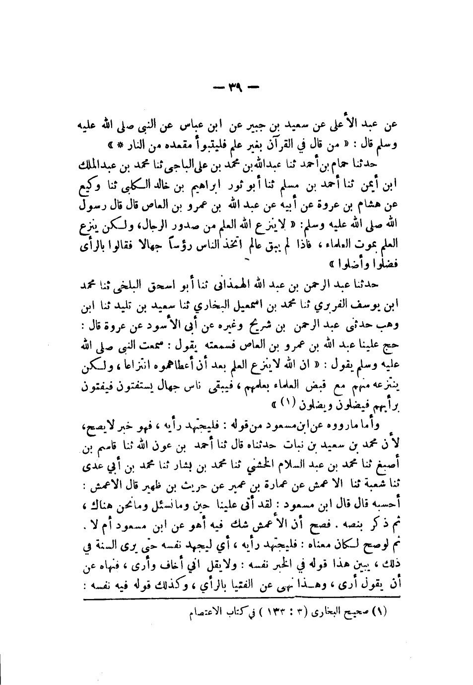 صلى الله عليه وسلم لا ينزع الله العلم من صدور الرجال ولكن ينزع العلم بموت العلماء فإذا لم يبق عالم اتخذ الناس رؤوسا جهالا فقالوا بالرأي فضلوا وأضلوا حدثنا عبد الرحمن بن عبد الله الهمذاني نا أبو إسحاق البلخي نا محمد بن يوسف الفربري نا محمد بن إسماعيل البخاري ثنا سعيد بن تليد نا ابن وهب حدثني عبد الرحمن بن شريح وغيره وعن أبي الأسود عن عروة قال حج علينا عبد الله بن عمرو بن العاص فسمعته يقول سمعت النبي صلى الله عليه وسلم يقول إن الله لا ينزع العلم بعد أن أعطاهموه انتزاعا ولكن ينتزعه منهم مع قبض العلماء بعلمهم فيبقى ناس جهال يستفتون فيفتون برأيهم فيضلون ويضلون وأما ما رووه عن أبي مسعود من قوله فليجتهد رأيه فهو خبر لا يصح لأن محمد بن سعيد بن نبات حدثناه قال ثنا أحمد بن عون الله نا قاسم بن أصبغ نا محمد بن عبد السلام الخشني نا محمد بن بشار نا محمد بن أبي عدي ثنا شعبة نا الأعمش عن عمارة بن عمير عن حريث بن ظهير قال الأعمش أحسبه قال قال ابن مسعود لقد أتى علينا حين وما نسأل وما نحن هناك ثم ذكر بنصه فصح أن الأعمش شك فيه أهو عن ابن مسعود أم لا ثم لو صح لكان معناه فليجتهد رأيه أي ليجهد نفسه حتى يرى السنة في ذلك يبين هذا قوله في الخبر نفسه ولا يقل إني أخاف وأرى فنهاه عن أن يقول أرى وهذا نهي عن الفتيا بالرأي وكذلك قوله فيه نفسه
