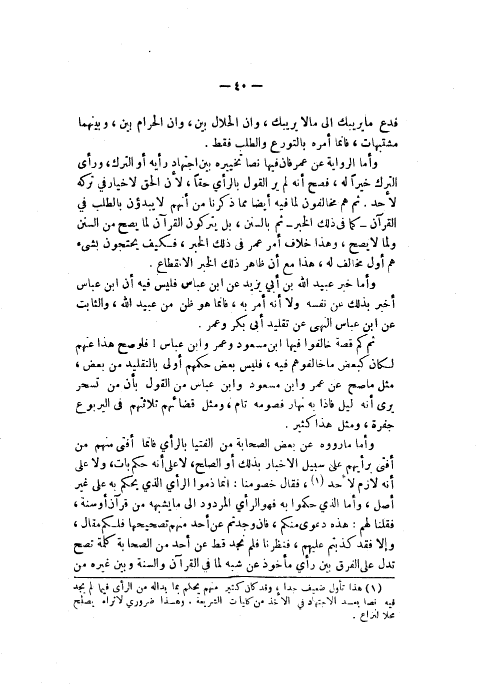 بذلك عن نفسه ولا أنه أمر به فإذا هو ظن من عبيد الله والثابت عن ابن عباس النهي عن تقليد أبي بكر وعمر ثم قصة خالفوا فيها ابن مسعود وعمر وابن عباس فلو صح هذا عنهم لكان كبعض ما خالفوهم فيه فليس بعض حكمهم أولى بالتقليد من بعض مثل ما صح عن عمر وابن مسعود وابن عباس من القول بأن من تسحر يرى أنه ليل فإذا به نهار فصومه تام ومثل قضائهم ثلاثتهم في اليربوع جفرة ومثل هذا كثير وأما ما رووه عن بعض الصحابة من الفتيا بالرأي فإنما أفتى منهم من أفتى برأيهم على سبيل الإخبار بذلك أو الصلح لا على أنه حكم بات ولا على أنه لازم لأحد فقال خصومنا إنما ذموا الرأي الذي يحكم به على غير أصل وأما الذي حكموا به فهو الرأي المردود إلى ما يشبه من قرآن أو سنة فقلنا لهم هذه دعوى منكم فإن وجدتم عن أحد منهم تصحيحا فلكم مقال وإلا فقد كذبتم عليهم فنظرنا فلم نجد قط عن أحد من الصحابة كلمة تصح تدل على الفرق بين رأي مأخوذ عن شبه لما في القرآن والسنة وبين غيره من