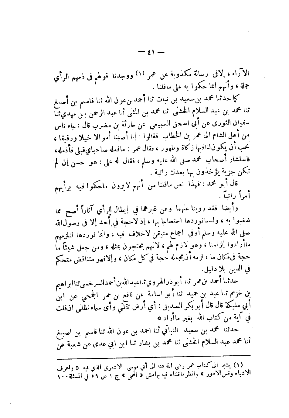 الآراء إلا في رسالة مكذوبة عن عمر ووجدنا قولهم في ذمهم الرأي جملة وأنهم حكموا به على ما قلنا كما حدثنا محمد بن سعيد بن نبات نا أحمد بن عون الله نا قاسم بن أصبغ ثنا محمد بن عبد السلام الخشني نا محمد بن المثنى نا عبد الرحمن بن مهدي نا سفيان الثوري عن أبي إسحاق السبيعي عن حارثة بن مضرب قال جاء ناس من أهل الشام إلى عمر بن الخطاب فقالوا إنا أصبنا أموالا خيلا ورقيقا نحب أن يكون لنا فيها زكاة وطهور فقال عمر ما فعله صاحباي قبل فأفعله فاستشار أصحاب محمد صلى الله عليه وسلم فقال له علي هو حسن إن لم تكن جزية يؤخذون بها بعد راتبة قال أبو محمد فهذا نص ما قلنا من أنهم لا يرون ما حكموا فيه برأيهم أمرا راتبا وأيضا فقد روينا عنهما وعن غيرهما في إبطال الرأي آثارا أصح مما شغبوا به ولسنا نوردها احتجاجا بها إذ لا حجة في أحد إلا في رسول الله صلى الله عليه وسلم أو في إجماع متيقن لا
