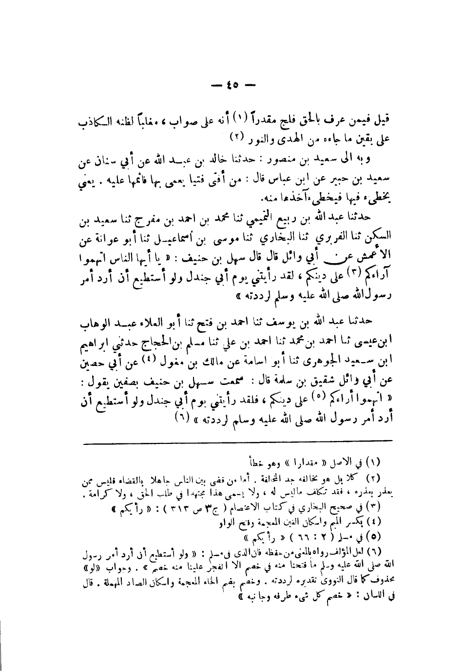 أبو العلاء عبد الوهاب بن عيسى نا أحمد بن محمد نا أحمد بن علي نا مسلم بن الحجاج حدثني إبراهيم بن سعيد الجوهري نا أبو أسامة عن مالك بن مغول عن أبي حصين عن أبي وائل شقيق بن سلمة قال سمعت سهل بن حنيف بصفين يقول اتهموا آراءكم على دينكم فلقد رأيتني يوم أبي جندل لو أستطيع أن أرد أمر رسول الله صلى الله عليه وسلم لرددته