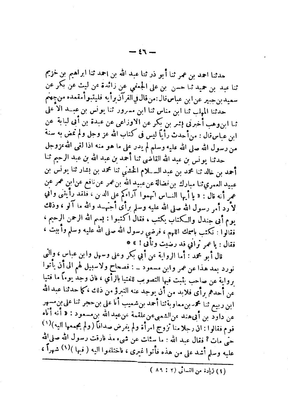 حدثنا أحمد بن عمر ثنا أبو ذر نا عبد الله بن أحمد نا إبراهيم بن خزيم ثنا عبد بن حميد حسن بن علي الجعفي عن زائدة عن ليث عن بكر عن سعيد بن جبير عن ابن عباس قال من قال في القرآن برأيه فليتبوأ مقعده من جهنم حدثنا المهلب نا ابن مناس نا ابن مسرور نا يونس بن عبد الأعلى نا ابن وهب أخبرني بشر بن بكر عن الأوزاعي عن عبدة بن أبي لبابة عن ابن عباس قال من أحدث رأيا ليس في كتاب الله عز وجل لم تمض به سنة من رسول الله صلى الله عليه وسلم لم يدر على ما هو منه إذا لقي الله عز وجل حدثنا يونس بن عبد الله القاضي نا أحمد بن عبد الله بن عبد الرحيم نا أحمد بن خالد نا محمد بن عبد الله الخشني نا محمد بن بشار نا يونس نا عبيد العمري ثنا مبارك بن فضالة عن عبيد الله بن عمر عن نافع عن ابن عمر عن عمر أنه قال يا أيها الناس اتهموا آراءكم على الدين فلقد رأيتني وإني لأرد أمر رسول الله صلى الله عليه وسلم برأي أجتهد والله ما آلو وذلك يوم أبي جندل والكتاب يكتب فقال اكتبوا بسم الله الرحمن الرحيم فقالوا نكتب باسمك اللهم فرضي رسول الله صلى الله عليه وسلم وأبيت فقال يا عمر تراني قد رضيت وتأبى قال أبو محمد أما الرواية عن أبي بكر وعلي وسهل وابن عباس والتي تورد بعد هذا عن عمر وابن مسعود فصحاح ولا سبيل لهم إلى أن يأتوا برواية عن صاحب يثبت فيها التصويب للفتيا بالرأي فأن وجد يوما ما فتيا عن أحدهم برأي فلا بد من أن يوجد عنه التبرؤ من ذلك كما حدثنا عبد الله بن ربيع حدثنا محمد بن معاوية نا أحمد بن شعيب أنا علي بن حجر نا علي بن مسهر عن داود بن أبي هند عن الشعبي عن علقمة عن عبد الله بن مسعود أتاه قوم فقالوا إن رجلا منا تزوج امرأة ولم يفرض صداقا ولم يجمعها إليه حتى مات فقال عبد الله ما سئلت عن شيء مذ فارقت رسول الله صلى الله عليه وسلم أشد علي من هذا فأتوا غيري فاختلفوا إليه فيها شهرا