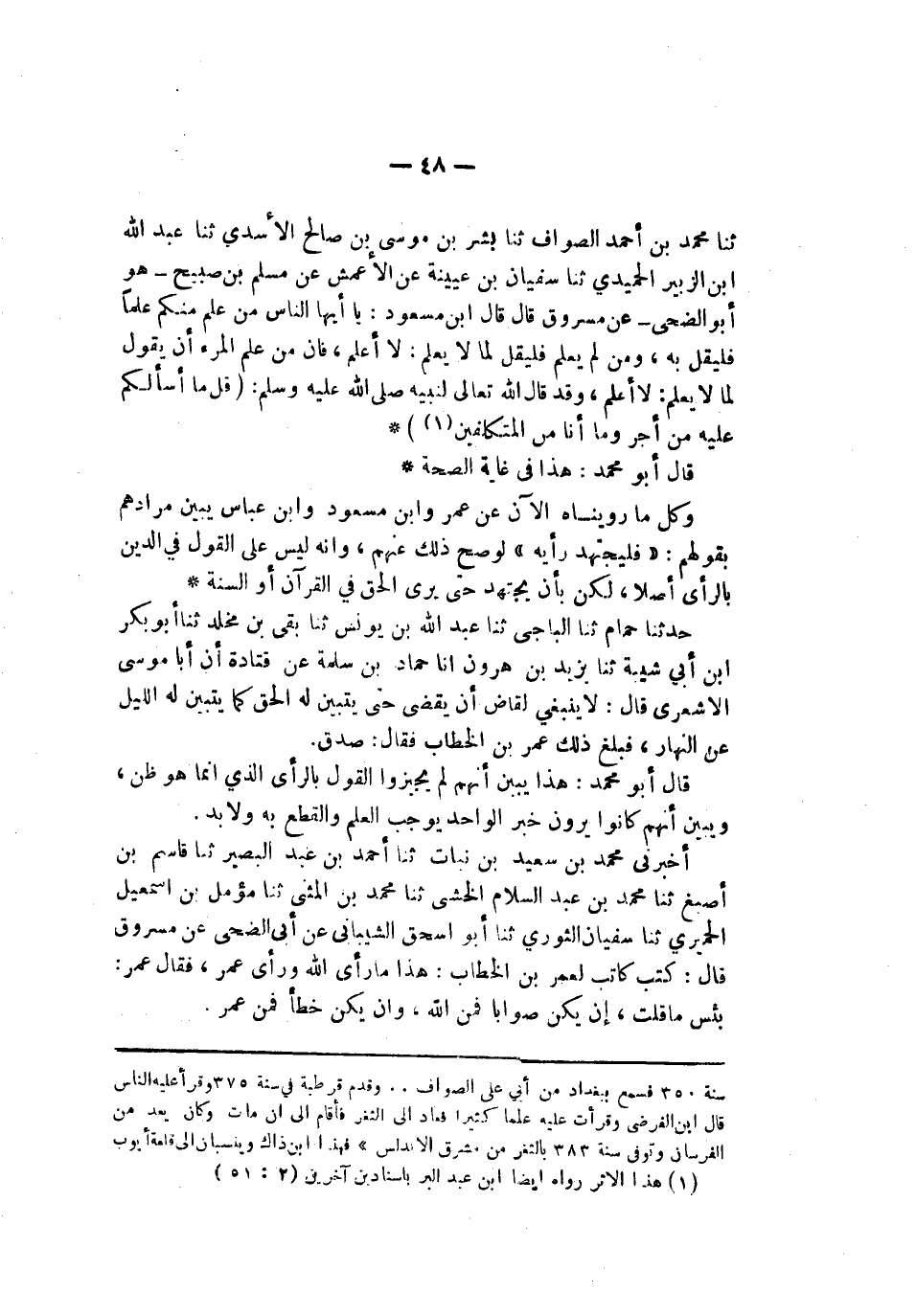 نا محمد بن أحمد الصواف نا بشر بن موسى بن صالح الأسدي نا عبد الله بن الزبير الحميدي حدثنا سفيان بن عيينة عن الأعمش عن مسلم بن صبيح هو أبو الضحى عن مسروق قال قال ابن مسعود يا أيها الناس من علم منكم علما فليقل به ومن لم يعلم فليقل لم لا يعلم لا أعلم فإن الله علم المرء وقد قال الله تعالى لنبيه صلى الله عليه وسلم {قل مآ أسألكم عليه من أجر ومآ أنآ من لمتكلفين} قال أبو محمد هذا في غاية الصحة وكل ما رويناه الآن من ابن عمر وابن مسعود وابن عباس يبين مرادهم بقولهم فليجتهد رأيه لو صح ذلك عنهم وأنه ليس على القول في الدين بالرأي أصلا لكن بأن يجتهد حتى يرى الحق في القرآن والسنة حدثنا حمام نا الباجي نا عبد الله بن يونس نا بقي بن مخلد نا أبو بكر بن أبي شيبة نا يزيد بن هارون نا حماد بن سلمة عن قتادة أن أبا موسى الأشعري قال لا ينبغي لقاض أن يقضي حتى يتبين له الحق كما يتبين له الليل عن النهار فبلغ ذلك عمر بن الخطاب فقال صدق قال أبو محمد هذا يبين أنهم لم يجيزوا القول بالرأي الذي إنما هو ظن وبين أنهم كانوا يرون خبر الواحد يوجب العلم والقطع