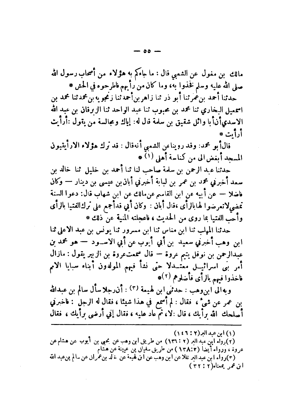 الله الأسدي أن أبا وائل شقيق بن سلمة قال له إياك ومجالسة من يقول أرأيت أرأيت قال أبو محمد وقد روينا عن الشعبي أنه قال قد ترك هؤلاء الأرأيتيون المسجد أبغض إلي من كناسة أهلي حدثنا عبد الرحمن بن سلمة صاحب لنا ثنا أحمد بن خليل نا خالد بن سعد أخبرني محمد بن عمر بن لبابة أخبرني أبان بن عيسى بن دينار وكان فاضلا عن أبيه عن ابن القاسم عن مالك عن ابن شهاب قال دعوا السنة تمضي لا تعرضوا لها بالرأي قال أبان وكان أبي قد أجمع على ترك الفتيا بالرأي وأحب الفتيا بما روي من الحديث فأعجلته المنية عن ذلك حدثنا المهلب ثنا بن مناس نا ابن مسرور نا يونس بن عبد الأعلى ثنا ابن وهب أخبرني سعيد بن أبي أيوب عن أبي الأسود هو محمد بن عبد الرحمن بن نوفل يتيم عروة قال سمعت عروة بن الزبير يقول ما زال أمر بني إسرائيل معتدلا حتى نشأ المولدون أبناء سبايا الأمم فأخذوا فيهم بالرأي فأضلوهم وبه إلى ابن وهب حدثني أبي لهيعة أن رجلا سأل سالم بن عبد الله بن عمر عن شيء فقال لم أسمع في هذا شيئا فقال له الرجل فأخبرني أصلحك الله برأيك قال لا ثم عاد عليه فقال إني أرضى برأيك فقال