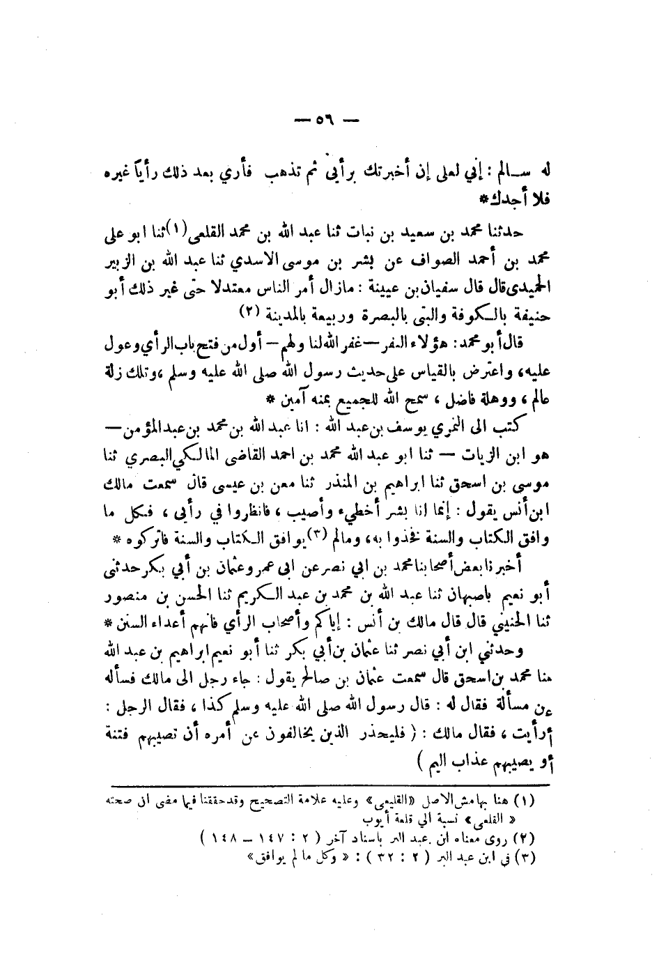 إسحاق نا إبراهيم بن المنذر نا معن بن عيسى قال سمعت مالك بن أنس يقول أنا بشر أخطىء وأصيب فانظروا في رأيي فكل ما وافق الكتاب والسنة فخذوا به وما لم يوافق الكتاب والسنة فاتركوه أخبرني بعض أصحابنا محمد بن أبي نصر عن أبي عمر وعثمان بن أبي بكر حدثني أبو نعيم بأصبهان ثنا عبد الله بن محمد بن عبد الكريم ثنا الحسن بن منصور ثنا الحنيني قال قال مالك بن أنس إياكم وأصحاب الرأي فإنهم أعداء السنن وحدثني ابن أبي نصر نا عثمان بن أبي بكر نا أبو نعيم إبراهيم بن عبد الله ثنا محمد بن إسحاق قال سمعت عثمان بن صالح يقول جاء رجل إلى مالك فسأله عن مسألة فقال له قال رسول الله صلى الله عليه وسلم كذا فقال الرجل أرأيت فقال مالك {لا تجعلوا دعآء لرسول بينكم كدعآء بعضكم بعضا قد يعلم لله لذين يتسللون منكم لواذا فليحذر لذين يخالفون عن أمره أن تصيبهم فتنة أو يصيبهم عذاب أليم}