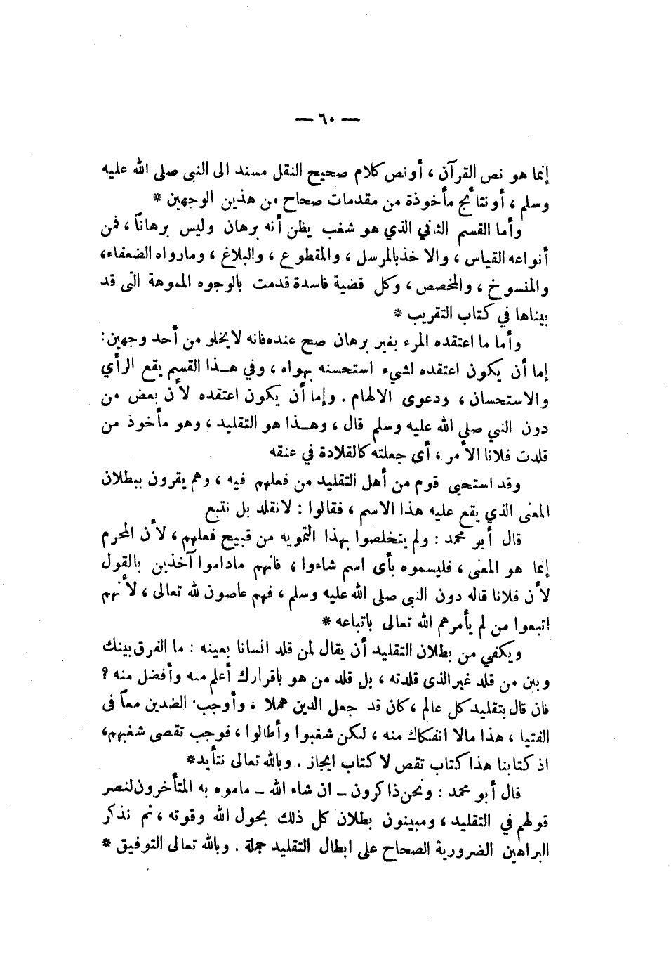 إنما هو نص القرآن أو نص كلام صحيح النقل مسند إلى النبي صلى الله عليه وسلم أو نتائج مأخوذة من مقدمات صحاح من هذين الوجهين وأما القسم الثاني الذي هو شغب يظن أنه برهان وليس برهانا فمن أنواعه القياس والأخذ بالمرسل والمقطوع والبلاغ وما رواه الضعفاء والمنسوخ والمخصص وكل قضية فاسدة قدمت بالوجوه المموهة التي قد بيناها في كتاب التقريب وأما ما اعتقده المرء بغير برهان صح عنده فإنه لا يخلو من أحد وجهين إما أن يكون اعتقده لشيء استحسنه بهواه وفي هذا القسم يقع الرأي والاستحسان ودعوى الإلهام وإما أن يكون اعتقده لأن بعض من دون النبي صلى الله عليه وسلم قال وهذا هو التقليد وهو مأخوذ من قلدت فلانا الأمر أي جعلته كالقلادة في عنقه وقد استحى قوم من أهل التقليد من فعلهم فيه وهم يقرون ببطلان المعنى الذي يقع عليه هذا الاسم فقالوا نقلد بل نتبع قال أبو محمد ولم يتخلصوا بهذا التمويه من قبيح فعلهم لأن الحرم إنما هو المعنى فليسموه بأي اسم شاؤوا فإنهم ما داموا آخذين بالقول لأن فلانا قاله دون النبي صلى الله عليه وسلم فهم عاصون لله تعالى لأنهم اتبعوا من لم يأمرهم الله تعالى باتباعه