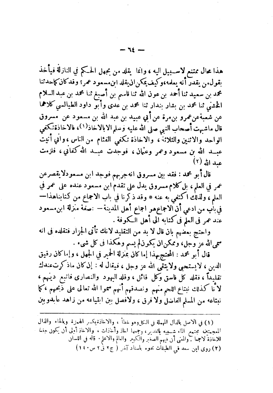 هذا محال ممتنع لا سبيل إليه وإنما يقلد من يجهل الحكم في النازلة فيأخذ بقول من يقدر أنه يعلمه وكيف يمكن أن يقلد ابن مسعود عمر وقد كان كما حدثنا محمد بن سعيد نا أحمد بن عون الله نا قاسم بن أصبغ نا محمد بن عبد السلام الخشني نا محمد بن بشار بندار نا محمد بن عدي وأبو داود الطيالسي كلاهما عن شعبة عن عمرو بن مرة عن أبي عبيد الله بن عبد الله بن مسعود عن مسروق قال ما شهدت أصحاب النبي صلى الله عليه وسلم إلا بالإخاذ فالإخاذة تكفي الواحد والاثنين والثلاثة والإخاذة تكفي الفئام من الناس وإني أتيت عبد الله بن مسعود وعمر وعثمان فوجدت عبد الله كفاني فلزمت عبد الله قال أبو محمد فقد بين مسروق أنه جربهم فوجد ابن مسعود لا يقصر عن عمر في العلم بل كلام مسروق يدل على تقدم ابن مسعود عنده على عمر في العلم ولذلك اكتفى به عنه وقد