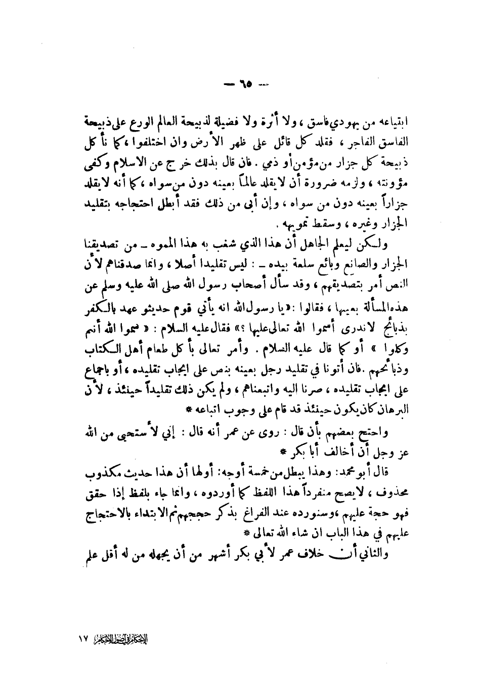 ابتياعه من يهودي فاسق ولا أثرة ولا فضيلة لذبيحة العالم الورع على ذبيحة الفاسق الفاجر فقلد كل قائل على ظهر الأرض وإن اختلفوا كما نأكل ذبيحة كل جزار من مؤمن أو ذمي فإن قال بذلك خرج عن الإسلام وكفى مؤونته ولزمه ضرورة ألا يقلد عالما بعينه دون من سواه كما أنه لا يقلد جزارا بعينه دون من سواه وإن أبى من ذلك فقد أبطل احتجاجه بتقليد الجزار وغيره وسقط تمويهه ولكن ليعلم الجاهل أن هذا الذي شغب به هذا المموه من تصديقنا الجزار والصانع وبائع سلعة بيده ليس تقليدا أصلا وإنما صدقناهم لأن النص أمر بتصديقهم وقد سأل أصحاب رسول الله صلى الله عليه وسلم عن هذه بعينها فقالوا يا رسول الله إنه يأتي قوم حديثو عهد بالكفر بذبائح لا ندري أسموا الله تعالى عليها فقال صلى الله عليه وسلم سموا الله أنتم وكلوا أو كما قال صلى الله عليه وسلم وأمر تعالى بأكل طعام أهل الكتاب وذبائحهم فإن أتونا في تقليد رجل بعينه بنص على إيجاب تقليده أو بإجماع على إيجاب تقليده صرنا إليه واتبعناهم ولم يكن ذلك تقليدا حينئد لأن البرهان كان يكون حينئذ قد قام على وجوب اتباعه واحتج بعضهم بأن قال روي عن عمر أنه قال إني لأستحي من الله عز وجل أن