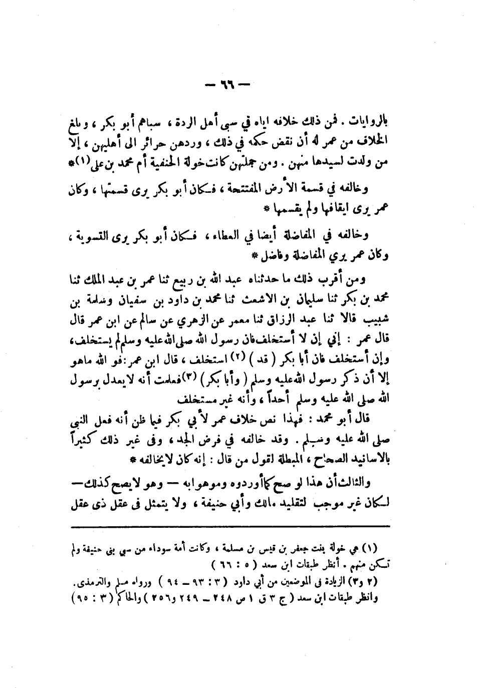 بالروايات فمن ذلك خلافه إياه في سبي أهل الردة سباهم أبو بكر وبلغ الخلاف عن عمر له أن نقض حكمه في ذلك وردهن حرائر إلى أهليهن إلا من ولدت لسيدها منهن ومن جملتهن كانت خولة الحنفية أم محمد بن علي وخالفه في قسمة الأرض المفتتحة فكان أبو بكر يرى قسمتها وكان عمر يرى إيقافها ولم يقسمها وخالفه في المفاضلة أيضا في العطاء فكان أبو بكر يرى التسوية وكان عمر يرى المفاضلة وفاضل ومن أقرب ذلك ما حدثناه عبد الله بن ربيع ثنا عمر بن عبد الملك ثنا محمد بن بكر ثنا سليمان بن الأشعث حدثنا محمد بن داود بن سفيان وسلمة بن شبيب قالا ثنا عبد الرزاق ثنا معمر عن الزهري عن سالم عن ابن عمر قال قال عمر إني إن لا أستخلف فإن رسول الله صلى الله عليه وسلم لم يستخلف وإن استخلف فإن أبا بكر قد استخلف قال ابن عمر فوالله ما هو إلا أن ذكر رسول الله صلى الله عليه وسلم وأبا بكر فعلمت أنه لا يعدل برسول الله صلى الله عليه وسلم أحدا وأنه غير مستخلف قال أبو محمد فهذا نص خلاف عمر لأبي بكر فيما ظن أنه فعل النبي صلى الله عليه وسلم وقد خالفه في فرض الجد وفي غير ذلك كثيرا بالأسانيد الصحاح المبطلة لقول من قال إنه كان لا يخالفه والثالث أن هذا لو صح كما أوردوه وموهوا به وهو لا يصح كذلك لكان غير موجب لتقليد مالك وأبي حنيفة ولا يتمثل في عقل ذي عقل