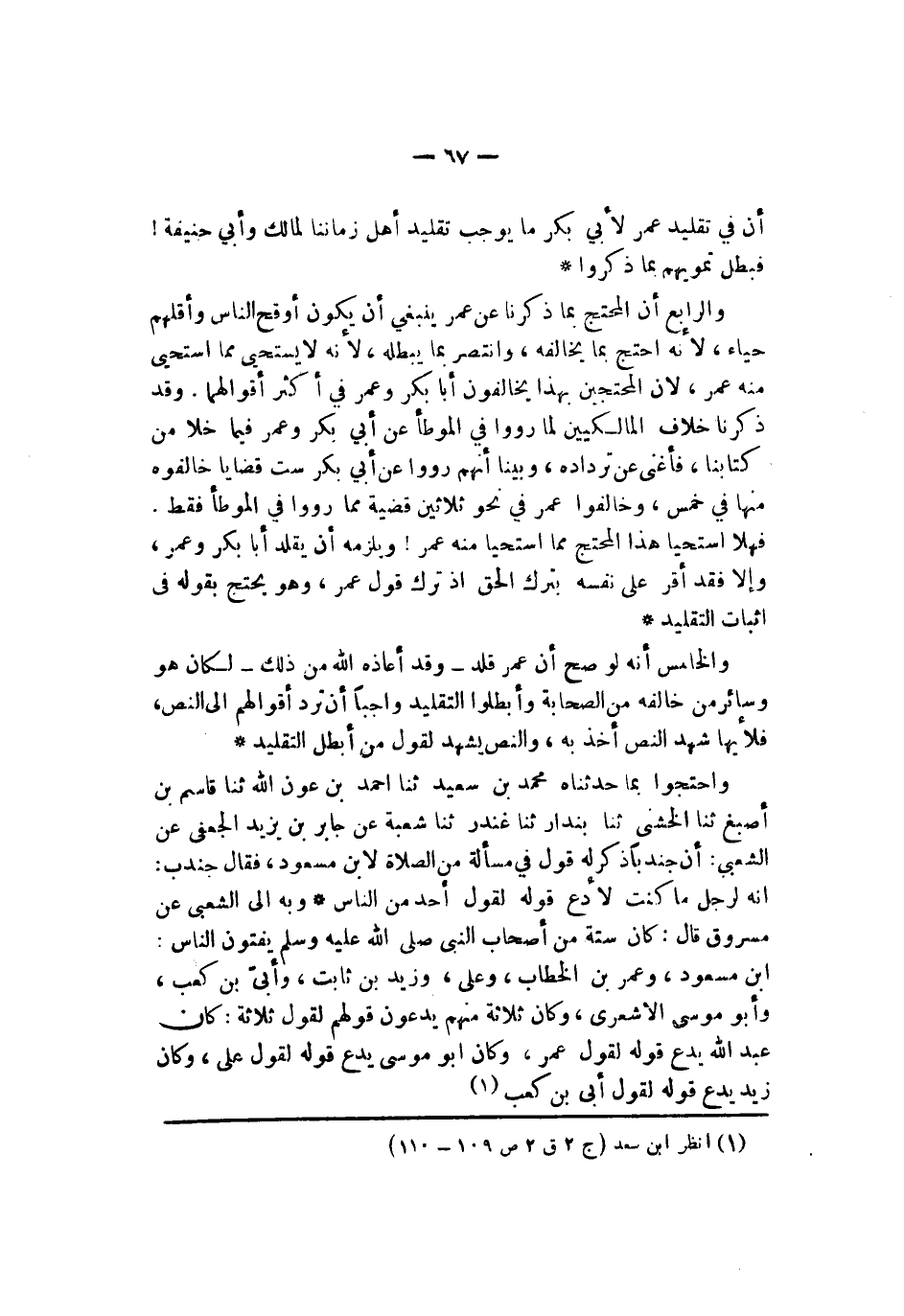 فهلا استحيا هذا المحتج مما استحيا منه عمر ويلزمه أن يقلد أبا بكر وعمر وإلا فقد أقر على نفسه بترك الحق إذ ترك قول عمر وهو يحتج بقوله في إثبات التقليد والخامس أنه لو صح أن عمر قلد وقد أعاذه الله من ذلك لكان هو وسائر من خالفه من الصحابة وأبطلوا التقليد راجيا أن ترد أقوالهم إلى النص فلأيها شهد النص أخذ به والنص يشهد لقول من أبطل التقليد واحتجوا بما حدثناه محمد بن سعيد ثنا أحمد بن عون الله ثنا قاسم بن أصبغ ثنا الخشني ثنا بندار ثنا غندر ثنا شعبة عن جابر بن يزيد الجعفي عن الشعبي أن جندبا ذكر له قول في مسألة من الصلاة لابن مسعود فقال جندب إنه لرجل ما كنت لأدع قوله لقول أحد من الناس وبه إلى الشعبي عن مسروق قال كان ستة من أصحاب النبي صلى الله عليه وسلم يفتون الناس ابن مسعود وعمر بن الخطاب وعلي وزيد بن ثابت وأبي بن كعب وأبو موسى الأشعري وكان ثلاثة منهم يدعون قولهم لقول ثلاثة كان عبد الله يدع قوله لقول عمر وكان أبو موسى يدع قوله لقول علي وكان زيد يدع قوله لقول أبي بن كعب