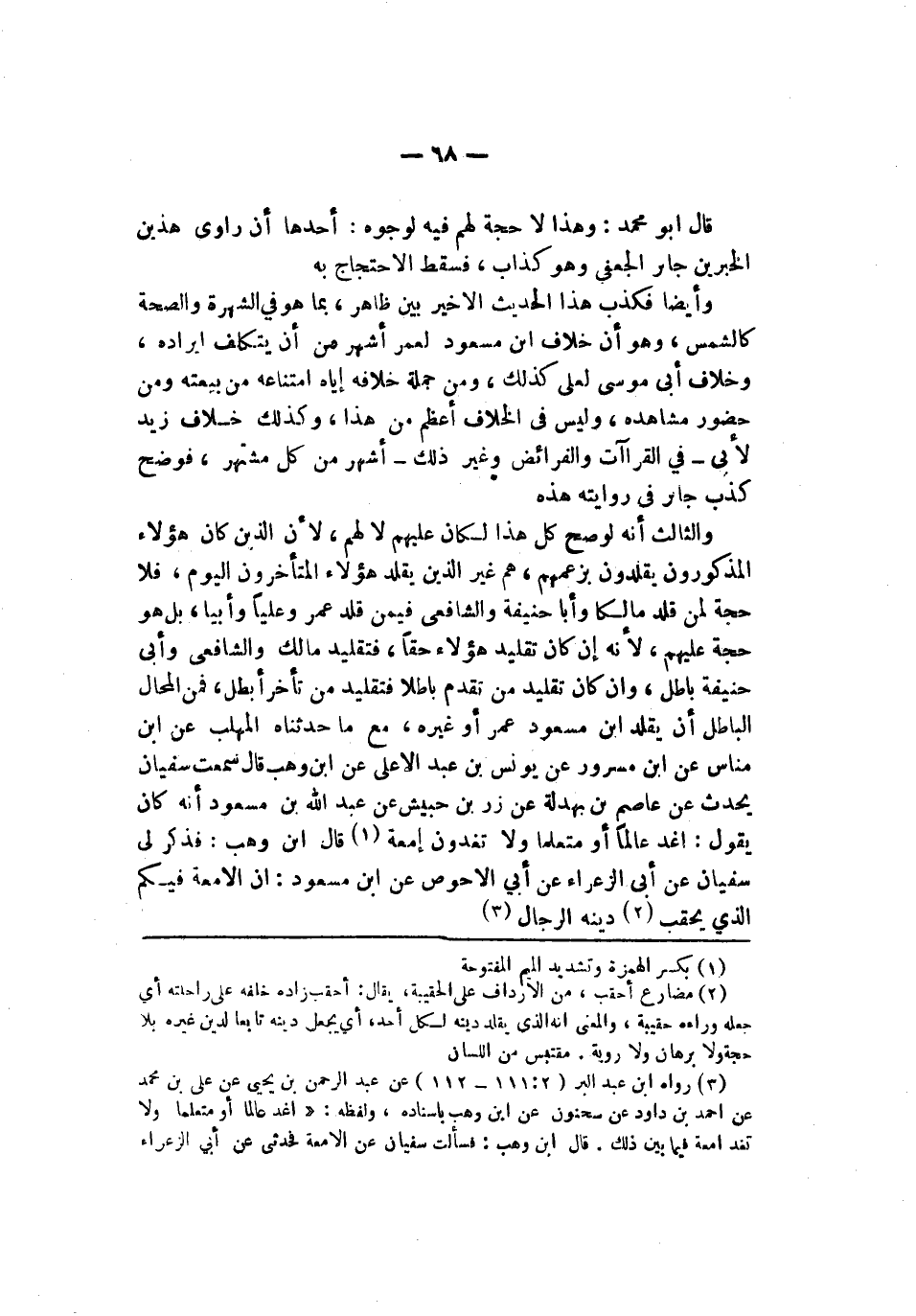 فتقليد من تأخر أبطل فمن المحال الباطل أن يقلد ابن مسعود عمر أو غيره مع ما حدثناه المهلب عن ابن مناس عن ابن مسرور عن يونس بن عبد الأعلى عن ابن وهب قال سمعت سليمان يحدث عن عاصم بن بهدلة عن زر بن حبيش عن عبد الله بن مسعود أنه كان يقول اغد عالما أو متعلما ولا تغدون إمعة قال ابن وهب فذكر لي سفيان عن أبي الزعراء عن أبي الأحوص عن ابن مسعود إنه الإمعة فيكم الذي يحقب دينه الرجال