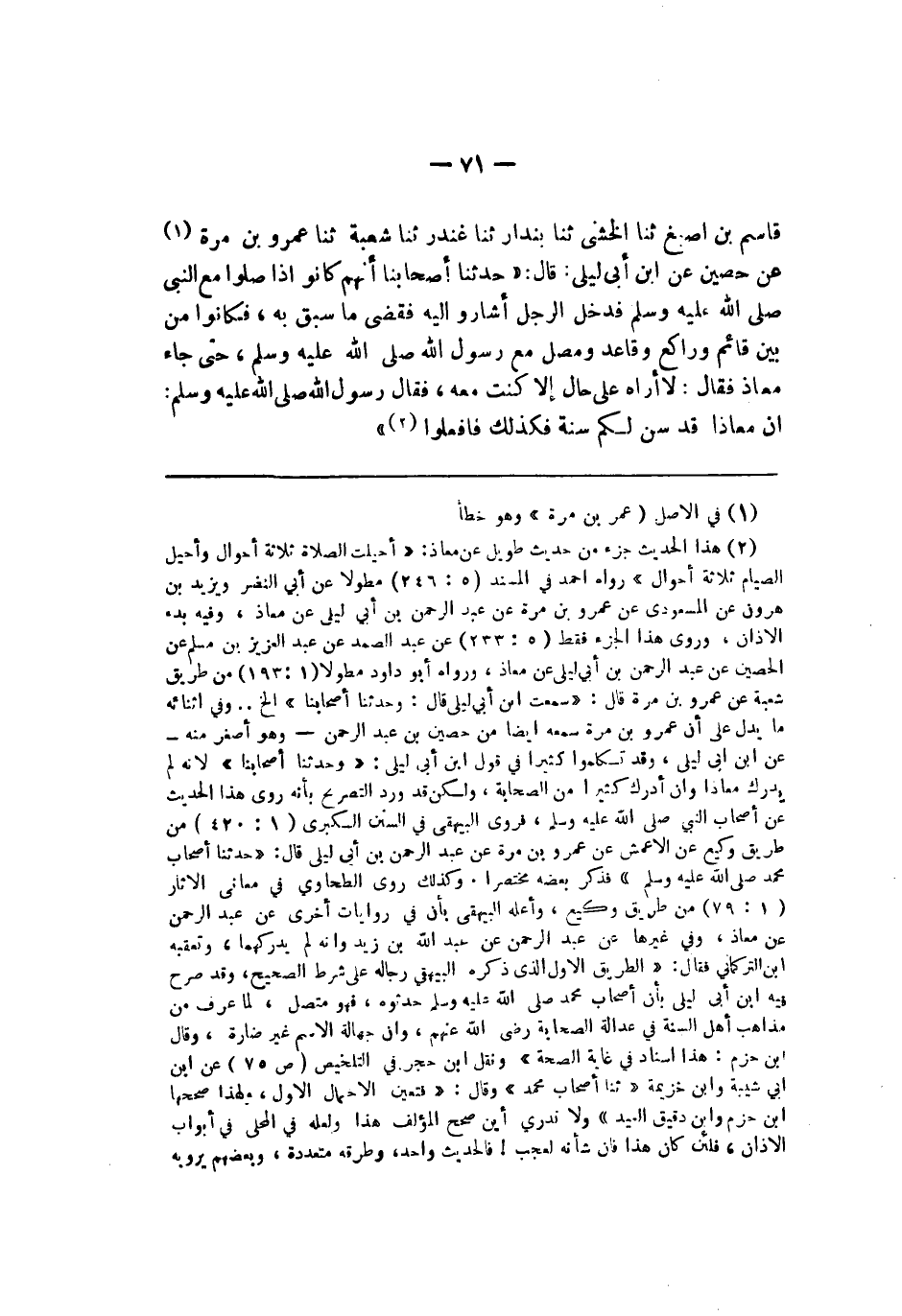 قاسم بن أصبغ ثنا الخشني ثنا بندار ثنا غندر ثنا شعبة ثنا عمرو بن مرة عن حصين عن ابن أبي ليلى قال حدثنا أصحابنا أنهم كانوا إذا صلوا مع النبي صلى الله عليه وسلم فدخل الرجل أشاروا إليه فقضى ما سبق به فكانوا من بين قائم وراكع وقاعد ومصل مع رسول الله صلى الله عليه وسلم حتى جاء معاذ فقال لا أراه على حال إلا كنت معه فقال رسول الله صلى الله عليه وسلم إن معاذا قد سن لكم