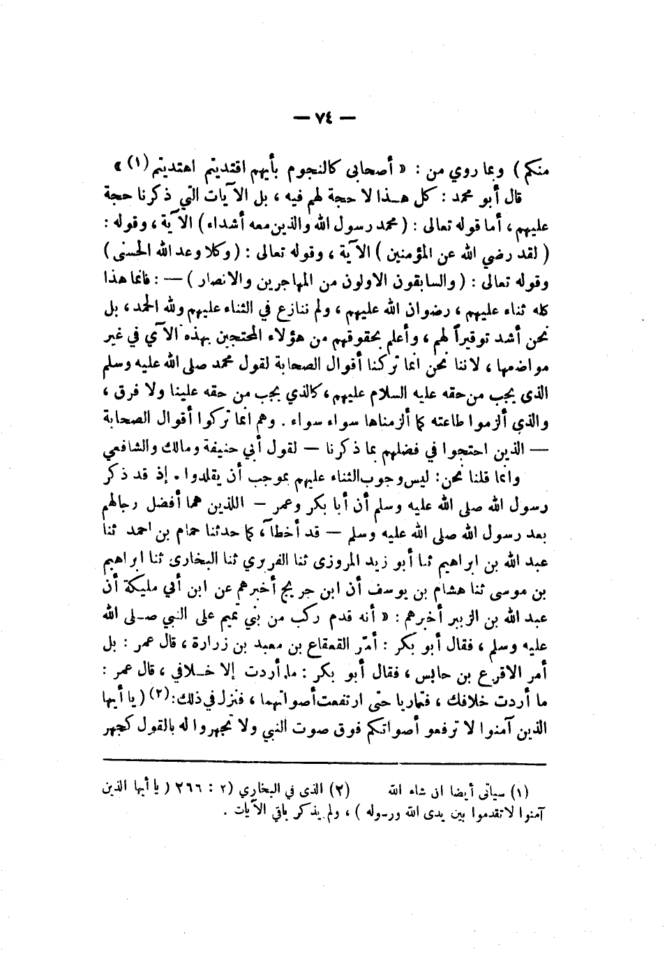 وإنما قلنا نحن ليس وجوب الثناء عليهم بموجب أن يقلدوا إذ قد ذكر رسول الله صلى الله عليه وسلم أن أبا بكر وعمر اللذين هما أفضل رجالهم بعد رسول الله صلى الله عليه وسلم قد أخطأ كما حدثنا حمام بن أحمد ثنا عبد الله بن إبراهيم نا أبو زيد المروزي نا الفربري نا البخاري نا إبراهيم بن موسى نا هشام بن يوسف أن ابن جريج أخبرهم عن ابن أبي مليكة أن عبد الله بن الزبير أخبرهم أنه قدم ركب من بني تميم عن النبي صلى الله عليه وسلم فقال أبو بكر أمر القعقاع بن معبد بن زرارة قال عمر بل أمر الأقرع بن حابس فقال أبو بكر ما أردت إلا خلافي قال عمر ما أردت خلافك فتماريا حتى ارتفعت أصواتهما فنزل في ذلك {يأيها لذين آمنوا لا ترفعوا أصواتكم فوق صوت النبي ولا تجهروا له بالقول كجهر