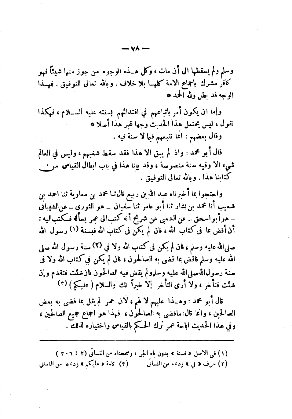 واحتجوا بما أخبرناه عبد الله بن ربيع قال نا محمد بن معاوية نا أحمد بن شعيب أنا محمد بن بشار نا أبو عمر نا سفيان هو الثوري عن الشيباني هو أبو إسحاق عن الشعبي عن شريح أنه كتب إلى عمر يسأله فكتب إليه أن اقض بما في كتاب الله فإن لم يكن في كتاب الله فبسنة رسول الله صلى الله عليه وسلم فإن لم يكن في كتاب الله ولا في سنة رسول الله صلى الله عليه وسلم فاقض بما قضى به الصالحون فإن لم يكن في كتاب الله ولا سنة رسول الله صلى الله عليه وسلم ولم يقض فيه الصالحون فإن شئت فتقدم وإن شئت فتأخر ولا أرى التأخر إلا خيرا لك والسلام عليكم قال أبو محمد وهذا عليهم لا لهم لأن عمر لم يقل بما قضى به بعض الصالحين وإنما قال ما قضى به الصالحون فهذا هو إجماع جميع الصالحين وفي هذا الحديث إباحة عمر ترك الحكم بالقياس واختياره لذلك