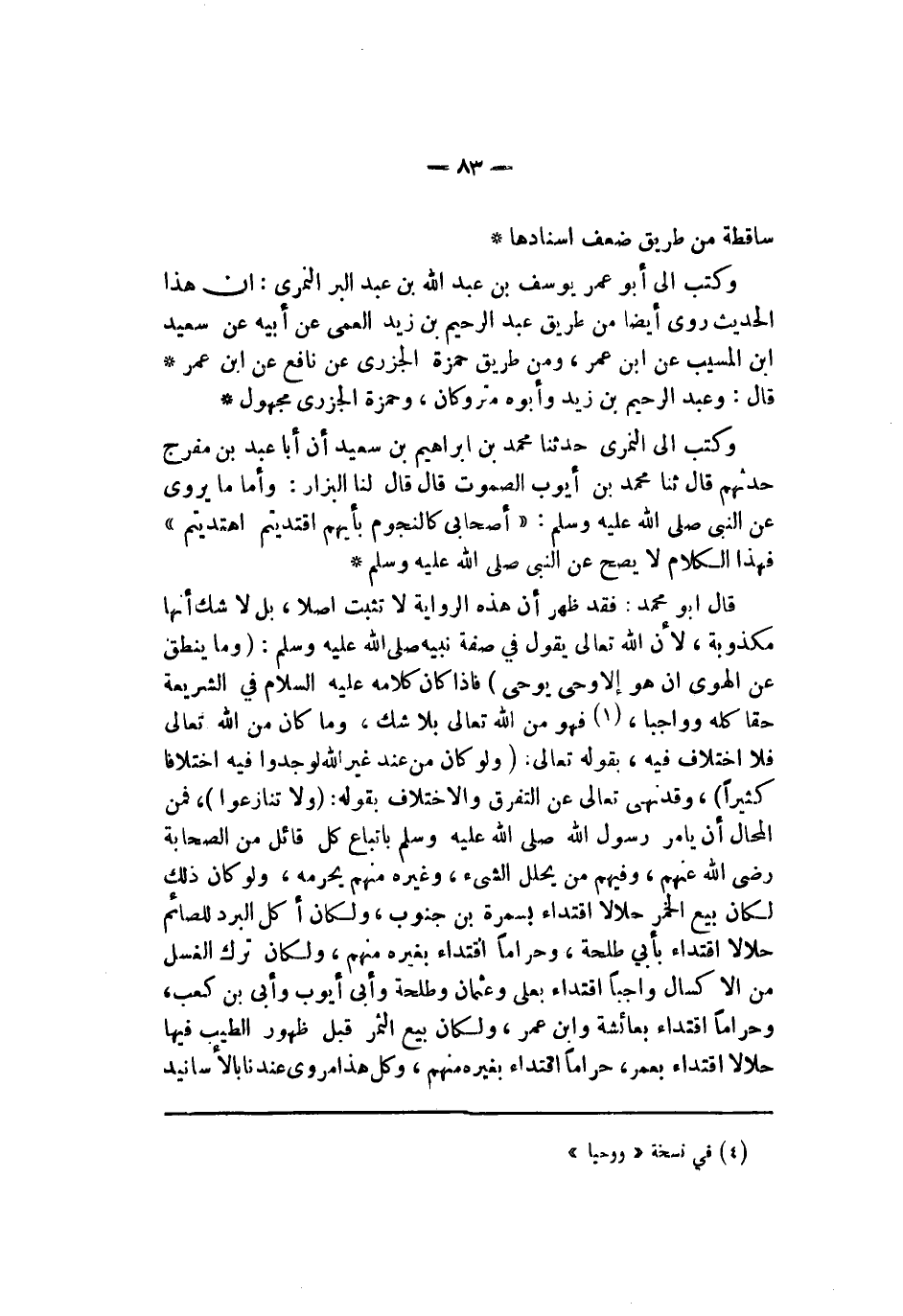 ساقطة من طريق ضعيف إسنادها وكتب إلي أبو عمر يوسف بن عبد الله بن عبد البر النمري أن هذا الحديث روي أيضا من طريق عبد الرحمن بن زيد العمي عن أبيه عن سعيد بن المسيب عن ابن عمر ومن طريق حمزة الجزري عن نافع عن ابن عمر قال وعبد الرحيم بن زيد وأبوه متروكان وحمزة الجزري مجهول وكتب إلي النمري حدثنا محمد بن إبراهيم بن سعيد أن أبا عبد الرحمن بن مفرج حدثهم قال ثنا محمد بن أيوب الصموت قال قال لنا البزار وأما ما يروى عن النبي صلى الله عليه وسلم أصحابي كالنجوم بأيهم اقتديتم اهتديتم فهذا كلام لا يصح عن النبي صلى الله عليه وسلم قال أبو محمد فقد ظهر أن هذه الرواية لا تثبت أصلا بلا شك أنها مكذوبة لأن الله تعالى يقول في صفة نبيه صلى الله عليه وسلم {وما ينطق عن لهوى * إن هو إلا وحي يوحى} فإذا كان كلامه صلى الله عليه وسلم في الشريعة حقا كله فهو من الله تعالى بلا شك وما كان من الله تعالى فلا اختلاف فيه بقوله تعالى {أفلا يتدبرون لقرآن ولو كان من عند غير لله لوجدوا فيه ختلافا كثيرا} وقد نهى تعالى عن التفرق والاختلاف بقوله {وأطيعوا لله ورسوله ولا تنازعوا فتفشلوا وتذهب ريحكم