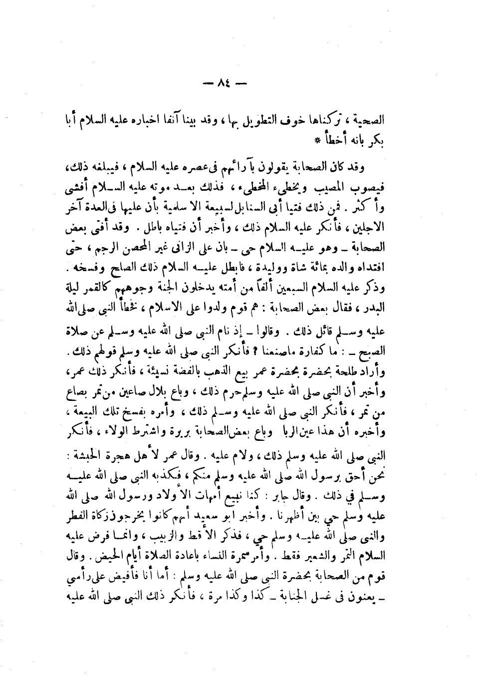 الصحيحة تركناها خوف التطويل بها وقد بينا آنفا إخباره عليه السلام أبا بكر بأنه أخطأ وقد كان الصحابة يقولون بآرائهم في عصره صلى الله عليه وسلم فيبلغه ذلك فيصوب المصيب ويخطىء المخطىء فذلك بعد موته صلى الله عليه وسلم أفشى وأكثر فمن ذلك فتيا أبي السنابل لسبيعة الأسلمية بأن عليها في العدة آخر الأجلين فأنكر صلى الله عليه وسلم ذلك وأخبر أن فتياه باطل وقد أفتى بعض الصحابة وهو صلى الله عليه وسلم حي بأن على الزاني غير المحصن الرجم حتى افتداه والده بمائة شاة ووليدة فأبطل صلى الله عليه وسلم ذلك الصلح وفسخه وذكر صلى الله عليه وسلم السبعين ألفا من أمته يدخلون الجنة وجوههم كالقمر ليلة البدر فقال بعض الصحابة هم قوم ولدوا على الإسلام فخطأ النبي صلى الله عليه وسلم قائل ذلك وقالوا إذ نام النبي صلى الله عليه وسلم عن صلاة الصبح ما كفارة ما صنعنا فأنكر النبي صلى الله عليه وسلم قولهم ذلك وأراد طلحة بحضرة عمر بيع الذهب بالفضة نسيئة فأنكر ذلك عمر وأخبر أن النبي صلى الله عليه وسلم حرم ذلك وباع بلال صاعين من تمر بصاع من تمر فأنكر النبي صلى الله عليه وسلم ذلك وأمره بفسخ تلك البيعة وأخبره أن هذا عين الربا وباع بعض الصحابة بريرة واشترط الولاء فأنكر النبي صلى الله عليه وسلم ذلك ولام عليه وقال عمر لأهل هجرة الحبشة نحن