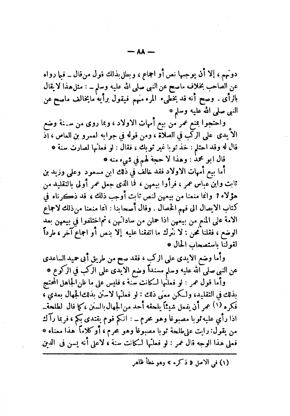 دونهم إلا أن يوجبها نص أو إجماع ويبطل بذلك قول من قال فيما رواه عن الصاحب بخلاف ما صح عن النبي صلى الله عليه وسلم مثل هذا لا يقال بالرأي وصح أنه قد يخطىء المرء منهم فيقول برأيه ما يخالف ما صح عن النبي صلى الله عليه وسلم واحتجوا بمنع عمر من بيع أمهات الأولاد بما روي من سنة وضع الأيدي على الركب في الصلاة ومن قوله في جوابه لعمرو بن العاص إذ قال له وقد احتلم خذ ثوبا غير ثوبك فقال لو فعلتها لصارت سنة قال أبو محمد وهذا لا حجة لهم في شيء منه أما بيع أمهات الأولاد فقد خالف في ذلك ابن مسعود وعلي وزيد بن ثابت وابن عباس عمر فرأوا بيعهن فما الذي جعل عمر أولى بالتقليد من هؤلاء وإنما منعنا من بيعهن لنص ثابت أوجب ذلك فقد ذكرناه في كتاب الإيصال إلى فهم الخصال وقال أصحابنا إنما منعنا من ذلك لإجماع الأمة على المنع من بيعهن إذا حملن من وسادتهن ثم اختلفوا في بيعهن بعد الوضع فقلنا نحن لا نترك ما اتفقنا عليه إلا بنص أو إجماع آخر طردا لقولنا باستصحاب الحال وأما وضع الأيدي على الركب فقد صح من طريق أبي حميد الساعدي عن النبي صلى الله عليه وسلم مسندا وضع الأيدي على الركب في الركوع وأما قول عمر لو فعلتها لكانت سنة فليس على ما ظن الجاهل المحتج بذلك في