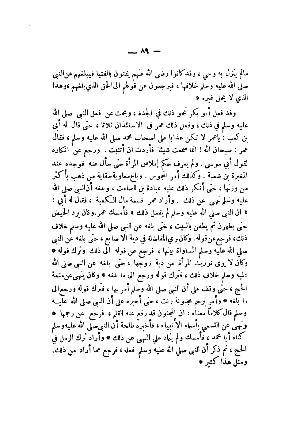 ما لم ينزل به وحي وقد كانوا رضي الله عنهم يفتون بالفتيا فيبلغهم عن النبي صلى الله عليه وسلم خلافها فيرجعون عن قولهم إلى الحق الذي بلغهم وهذا لا يحل غيره وقد فعل أبو بكر نحو ذلك في الجدة وبحث عن فعل النبي صلى الله عليه وسلم في ذلك وفعل ذلك عمر في الاستئذان ثلاثا حتى قال له أبي بن كعب يا عمر لا تكن عذابا على أصحاب محمد صلى الله عليه وسلم فقال عمر سبحان الله إنما سمعت شيئا فأردت أن أتثبت ورجع عن إنكاره لقول أبي موسى ولم يعرف حكم إملاص المرأة حتى سأل عنه فوجده عند المغيرة بن شعبة وكذلك أمر المجوس وباع معاوية سقاية من ذهب بأكثر من وزنها حتى أنكر ذلك عليه عبادة بن الصامت وبلغه أن النبي صلى الله عليه وسلم نهى عن ذلك وأراد عمر قسمة مال الكعبة فقال له أبي إن النبي صلى الله عليه وسلم لم يفعل ذلك فأمسك عمر وكان يرد الحيض حتى يطهرن ثم يطفن بالبيت حتى بلغه عن النبي صلى الله عليه وسلم خلاف ذلك فرجع عن قوله وكان يرد المفاضلة في دية الأصابع حتى بلغه عن النبي صلى الله عليه وسلم المساواة بينها فرجع عن قوله إلى ذلك وترك قوله وكان لا يرى توريث المرأة في دية زوجها حتى بلغه عن النبي صلى الله عليه وسلم خلاف ذلك فترك قوله ورجع إلى ما بلغه وكان ينهى عن متعة الحج حتى وقف على أنه صلى الله عليه وسلم أمر بها فترك قوله ورجع إلى ما بلغه وأمر برجم مجنونة زنت حتى أخبره علي أن النبي صلى الله عليه وسلم قال كلاما معناه إن المجنون قد رفع عنه القلم فرجع عن رجمها ونهى عن التسمي بأسماء الأنبياء فأخبره طلحة أن