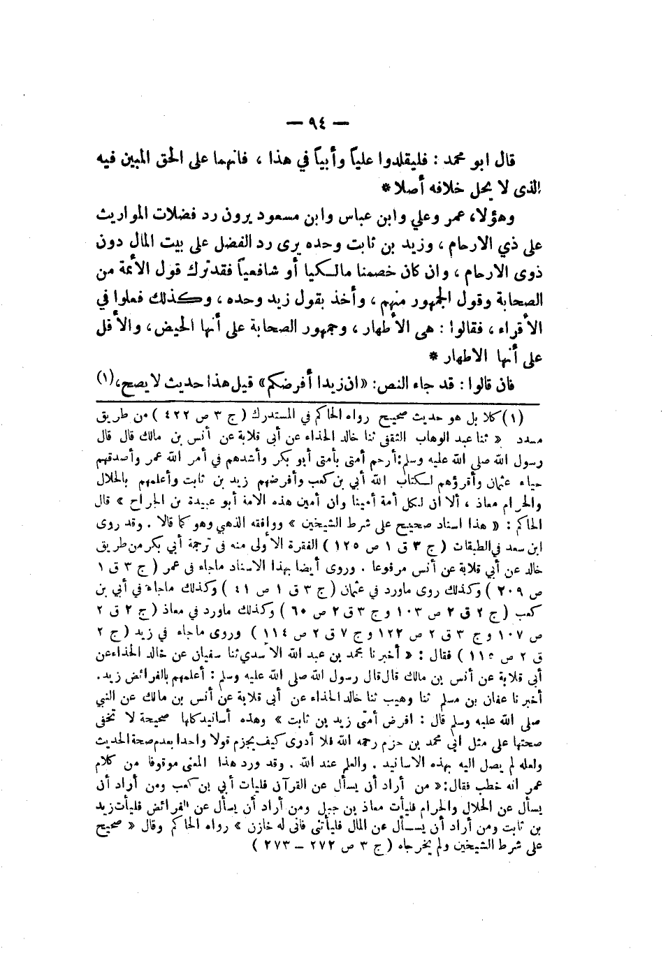 قال أبو محمد فليقلدوا عليا وأبيا في هذا فإنهما على الحق المبين فيه الذي لا يحل خلافه أصلا وهؤلاء عمر وعلي وابن عباس وابن مسعود يرون رد فضلات المواريث على ذوي الأرحام وزيد بن ثابت وحده يرى رد الفضل على بيت المال دون ذوي الأرحام وإن كان خصمنا مالكيا أو شافعيا فقد ترك قول الأئمة من الصحابة وقول الجمهور منهم وأخذ بقول زيد وحده وكذلك فعلوا في الأقراء فقالوا هي الأطهار وجمهور الصحابة على أنه الحيض والأقل على أنها الأطهار فإن قالوا قد جاء النص إن زيدا أفرضكم قيل هذا الحديث لا يصح