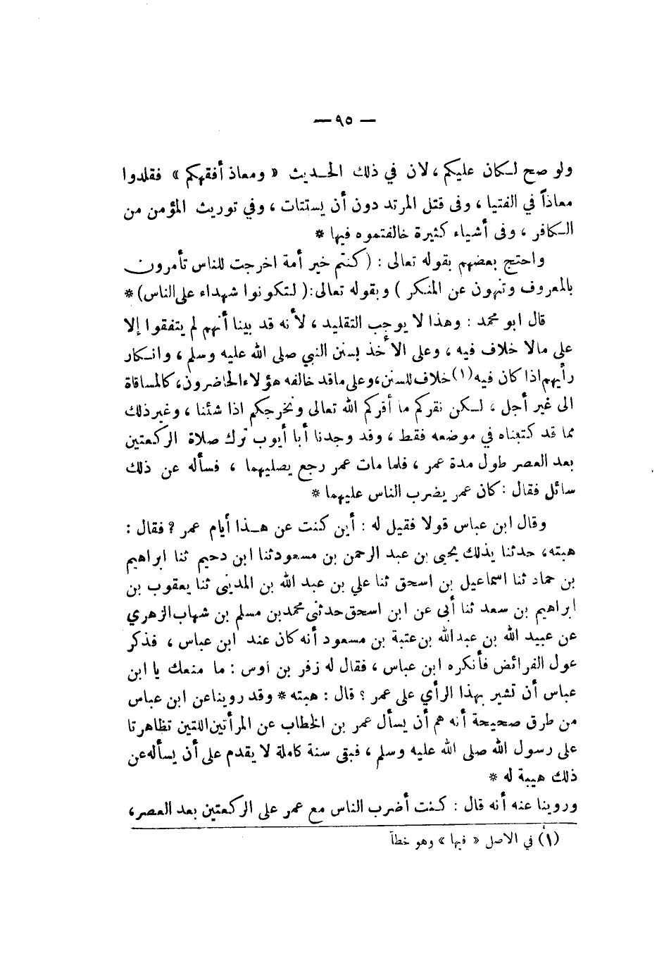 ولو صح لكان عليكم لأن في ذلك الحديث ومعاذ أفقهكم فقلدوا معاذا في الفتيا وفي قتل المرتد دون أن يستتاب وفي توريث المؤمن من الكافر وفي أشياء كثيرة خالفتموه فيها واحتج بعضهم بقوله تعالى {كنتم خير أمة أخرجت للناس تأمرون بلمعروف وتنهون عن لمنكر وتؤمنون بلله ولو آمن أهل لكتاب لكان خيرا لهم منهم لمؤمنون وأكثرهم لفاسقون} وبقوله تعالى {وكذلك جعلناكم أمة وسطا لتكونوا شهدآء على لناس ويكون لرسول عليكم شهيدا وما جعلنا لقبلة لتي كنت عليهآ إلا لنعلم من يتبع لرسول ممن ينقلب على عقبيه وإن كانت لكبيرة إلا على لذين هدى لله وما كان لله ليضيع إيمانكم إن لله بلناس لرءوف رحيم} قال أبو محمد وهذا لا يوجب التقليد لأنه قد بينا أنهم لم يتفقوا إلا على ما لا خلاف فيه وعلى الأخذ بسنن النبي صلى الله عليه وسلم وإنكار رأيهم إذا كان فيه خلاف للسنن وعلى ما قد خالفه هؤلاء الحاضرون كالمساقات إلى غير أجل لكن نقركم ما أقركم الله
