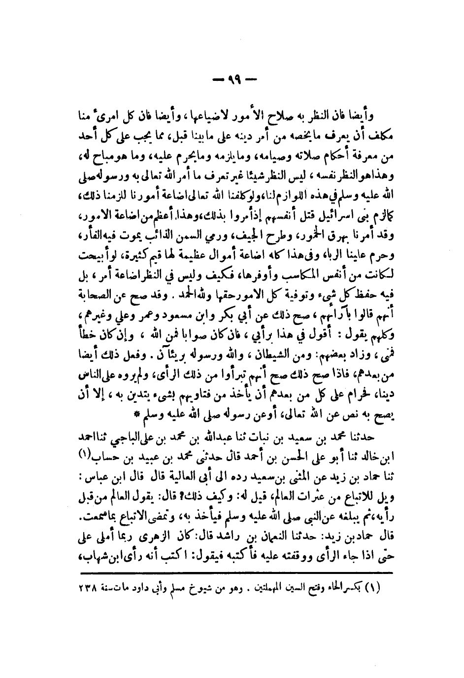 ورمي السمن الذائب يموت فيه الفأر وحرم علينا الربا وفي هذا كله إضاعة أموال عظيمة لها قيم كثيرة لو أبيحت لكانت من أنفس المكاسب وأوفرها فكيف وليس في النظر إضاعة أمر بل فيه حفظ كل شيء وتوفية كل الأمور حقها ولله الحمد وقد صح عن الصحابة أنهم قالوا بآرائهم صح ذلك عن أبي بكر وابن مسعود وعمر وعلي وغيرهم وكلهم يقول أقول في هذا برأيي فإن كان صوابا فمن الله وإن كان خطأ فمني وزاد بعضهم ومن الشيطان والله ورسوله بريئان وفعل ذلك أيضا من بعدهم فإذا صح ذلك صح أنهم تبرؤوا من ذلك الرأي ولم يروه على الناس دينا فحرام على كل من بعدهم أن يأخذ من فتاويهم بشيء يتدين به إلا أن يصح به نص عن الله تعالى أو عن رسوله صلى الله عليه وسلم حدثنا محمد بن سعيد بن نبات نا عبد الله بن محمد بن علي الباجي نا أحمد بن خالد نا أبو علي الحسن بن أحمد قال حدثني محمد بن عبيد بن حساب نا حماد بن زيد عن المثنى بن سعيد رده إلى أبي العالية قال قال العباس ويل للأتباع من عثرات العالم قيل له كيف ذلك قال يقول العالم من قبل رأيه ثم يبلغه عن النبي صلى الله عليه وسلم فيأخذ به وتمضي الأتباع بما سمعت قال حماد بن زيد حدثنا النعمان بن راشد قال كان الزهري ربما أملى علي حتى إذا جاء الرأي ووقفته عليه فأكتبه فيقول اكتب إنه رأي ابن شهاب