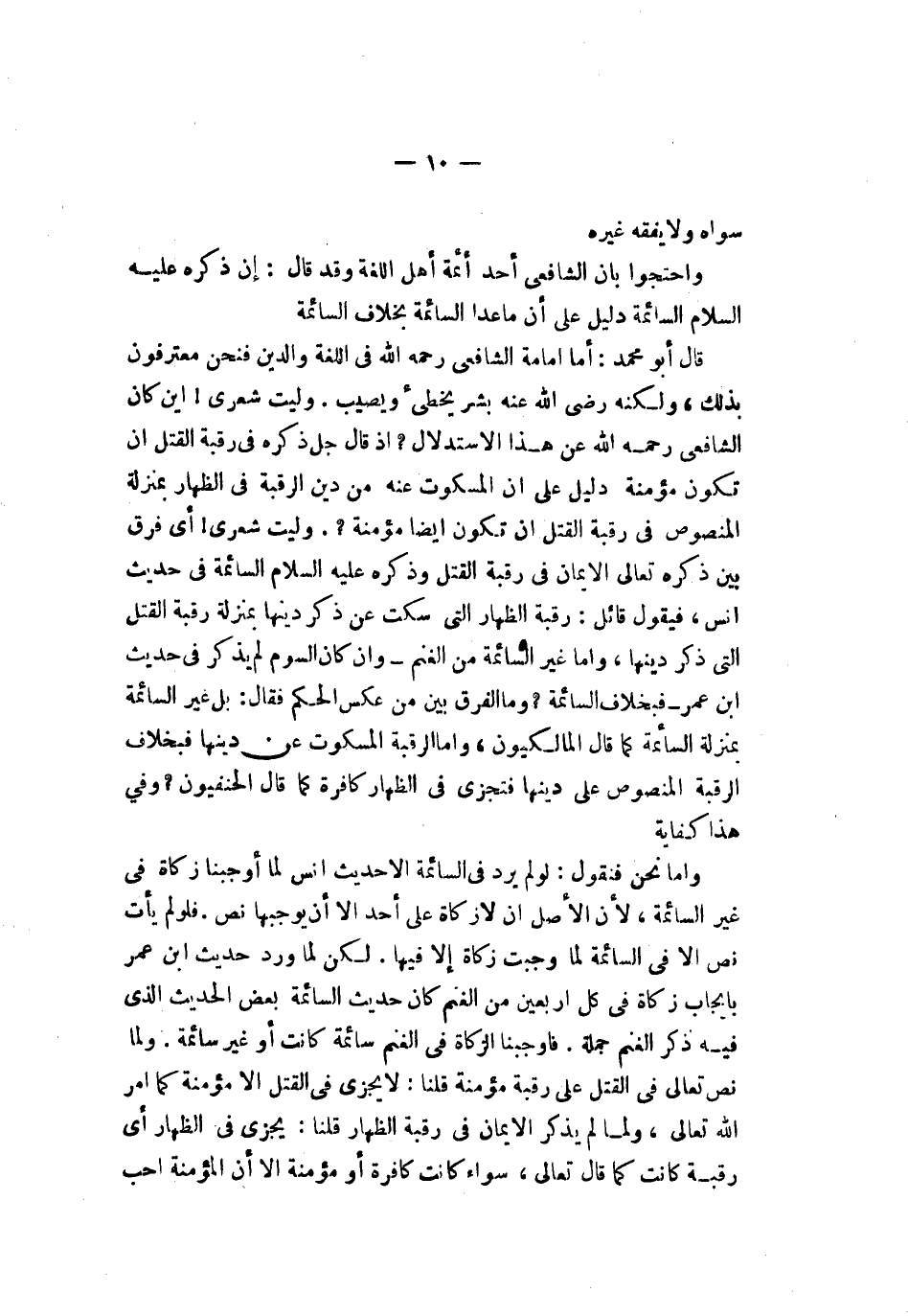 ولكنه رضي الله عنه بشر يخطىء ويصيب وليت شعري أين كان الشافعي رحمه الله عن هذا الاستدلال إذ قال جل ذكره في رقبة القتل أن تكون مؤمنة دليل على أن المسكوت عنه من دين الرقبة في الظهار بمنزلة المنصوص في رقبة القتل أن تكون أيضا مؤمنة وليت شعري أي فرق بين ذكره تعالى الأيمان في رقبة القتل وذكره صلى الله عليه وسلم السائمة في حديث أنس فبقول قائل رقبة الظهار التي سكت عن ذكر دينها بمنزلة رقبة القتل التي ذكر دينها وأما غير السائمة من الغنم وإن كان السوم لم يذكر في حديث ابن عمر فبخلاف السائمة وما الفرق بين من عكس الحكم فقال بل غير السائمة بمنزلة السائمة كما قال المالكيون وأما الرقبة المسكوت عن دينها فبخلاف الرقبة المنصوص على دينها فتجزىء في الظهار كافرة كما قال الحنفيون وفي هذا كفاية وأما نحن فنقول لو لم يرد في السائمة إلا حديث أنس لما أوجبنا زكاة في غير السائمة لأن الأصل أن لا زكاة على أحد إلا أن يوجبها نص فلو لم يأت نص إلا في السائمة لما وجبت زكاة إلا فيها لكن لما ورد حديث ابن عمر بإيجاب زكاة كل أربعين من الغنم كان حديث السائمة بعض الحديث الذي فيه ذكر الغنم جملة فأوجبنا الزكاة في الغنم سائمة كانت أو غير سائمة ولما نص تعالى في القتل على رقبة مؤمنة قلنا لا يجزىء في القتل إلا مؤمنة كما أمر الله تعالى ولما لم يذكر الإيمان في رقبة الظهار قلنا يجزىء الظهار أي رقبة كانت كما قال تعالى سواء كانت كافرة أو مؤمنة إلا أن المؤمنة أحب