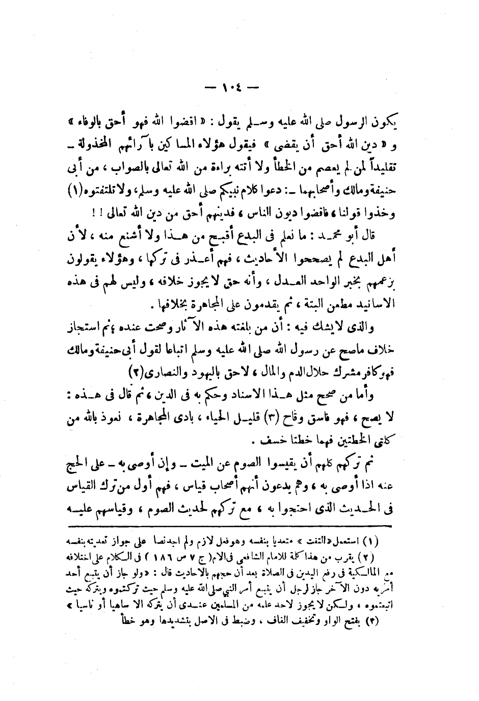 اقضوا الله فهو أحق بالوفاء ودين الله أحق أن يقضى فيقول هؤلاء المساكين بآرائهم المخذولة تقليدا لمن لم يعصم من الخطأ ولا أتته براءة من الله تعالى بالصواب من أبي حنيفة ومالك وأصحابهما دعوا كلام نبيكم صلى الله عليه وسلم ولا تلتفتوه وخذوا قولنا فاقضوا ديون الناس فدينهم أحق من دين الله تعالى قال أبو محمد ما نعلم في البدع أقبح من هذا ولا أشنع منه لأن أهل البدع لم يصححوا الأحاديث فهم أعذر في تركها وهؤلاء يقولون بزعمهم بخبر الواحد العدل وأنه حق لا يجوز خلافه وليس لهم في هذه الأسانيد مطعن البتة ثم يقدمون على المجاهرة بخلافها والذي لا يشك فيه أن من بلغته هذه الآثار وصحت عنده ثم استجاز خلاف ما صح عن رسول الله صلى الله عليه وسلم إتباعا لقول أبي حنيفة ومالك فهو كافر مشرك حلال الدم والمال لاحق باليهود النصارى وأما من صحح مثل هذا الإسناد وحكم به في الدين ثم قال في هذه لا يصح فهو فاسق وقاح قليل الحياء بادي المجاهرة نعوذ بالله من كلتي الخطتين فهما خطتا خسف ثم تركهم كلهم أن يقيسوا الصوم عن الميت وإن أوصى به على الحج عنه إذا أوصى به وهم يدعون أنهم أصحاب قياس فهم أول من ترك القياس في الحديث الذي احتجوا به مع تركهم لحديث الصوم وقياسهم عليه