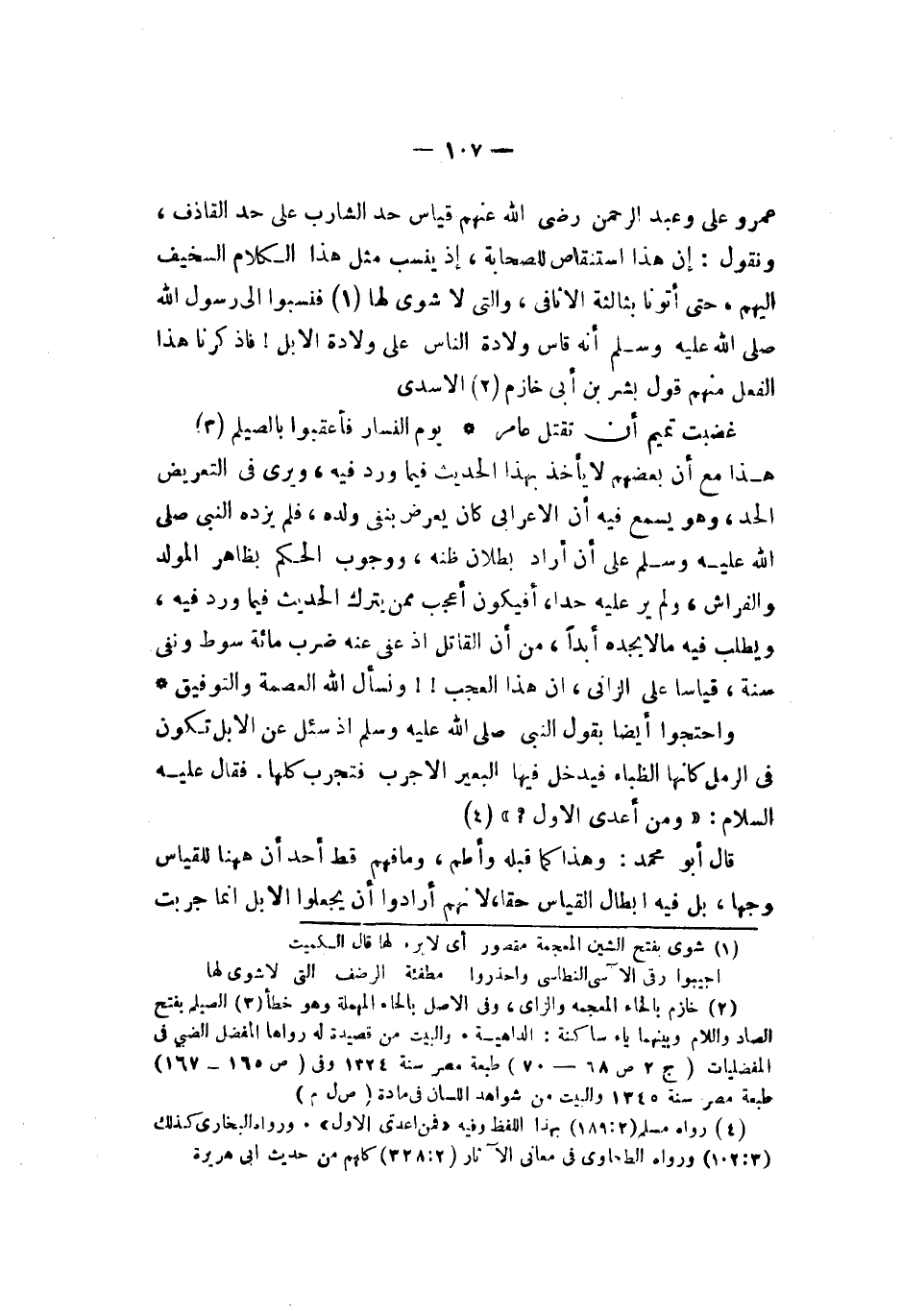 عمر وعلي وعبد الرحمن رضي الله عنهم قياس حد الشارب على حد القاذف ونقول إن هذا استنقاص للصحابة إذ ينسب مثل هذا الكلام السخيف إليهم حتى أتونا بالثالثة الأثافي والتي لا شوى لها فنسبوا إلى رسول الله صلى الله عليه وسلم أنه قاس ولادة الناس على ولادة الإبل فأذكرنا هذا الفعل منهم قول بشر بن أبي حازم الأسدي غضبت تميم أن تقتل عامر يوم النسار فأعقبوا بالصيلم هذا مع أن بعضهم لا يأخذ بهذا الحديث فيما ورد فيه ويروى في التعريض الحد وهو يسمع فيه أن الأعرابي كان يعرض بنفي ولده فلم يزده النبي صلى الله عليه وسلم على أن أراد بطلان ظنه ووجوب الحكم بظاهر المولد والفراش ولم ير عليه حدا أفيكون أعجب ممن يترك الحديث فيما ورد فيه ويطلب فيه ما لا يجده أبدا ومن أن القاتل إذا عفي عنه ضرب مائة سوط ونفي سنة قياسا على الزاني إن هذا العجب ونسأل الله العصمة والتوفيق واحتجوا أيضا بقول النبي صلى الله عليه وسلم إذ سئل عن الإبل تكون في الرسل كأنها الظباء فيدخل فيها البعير الأجرب فتجرب كلها فقال صلى الله عليه وسلم ومن أعدى الأول قال أبو محمد وهذا كما قبله وأطم وما فهم قط أحد أن هذا القياس وجها بل فيه إبطال القياس حقا لأنهم أرادوا أن يجعلوا الإبل إنما جربت