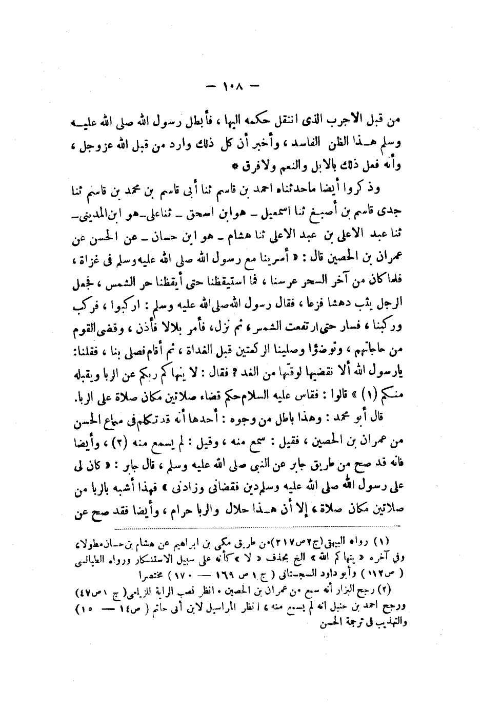 أسرينا مع رسول الله صلى الله عليه وسلم في غزاة فلما كان من آخر السحر عرسنا فما استيقظنا حتى أيقظنا حر الشمس فجعل الرجل يثب دهشا فزعا فقال رسول الله صلى الله عليه وسلم اركبوا فركب وركبنا فسار حتى ارتفعت الشمس ثم نزل فأمر بلال فأذن قضى حاجاتهم وتوضؤوا فصلينا ركعتين قبل الغداة ثم أقام فصلى بنا فقلنا يا رسول الله ألا نقضيها لوقتها من الغد فقال لا ينهاكم ربكم عن الربا ويقبله منكم قالوا فقاس صلى الله عليه وسلم حكم قضاء صلاتين مكان صلاة على الربا قال أبو محمد وهذا باطل من وجوه أحدها أنه قد تكلم في سماع الحسن بن عمران بن الحصين فقيل سمع منه وقيل لم يسمع منه وأيضا فإنه قد صح من طريق جابر عن النبي صلى الله عليه وسلم قال جابر كان على رسول الله صلى الله عليه وسلم دين فقضاني وزادني فهذا أشبه بالربا من صلاتين مكان صلاة إلا أن هذا حلال والربا حرام وأيضا فقد صح عن