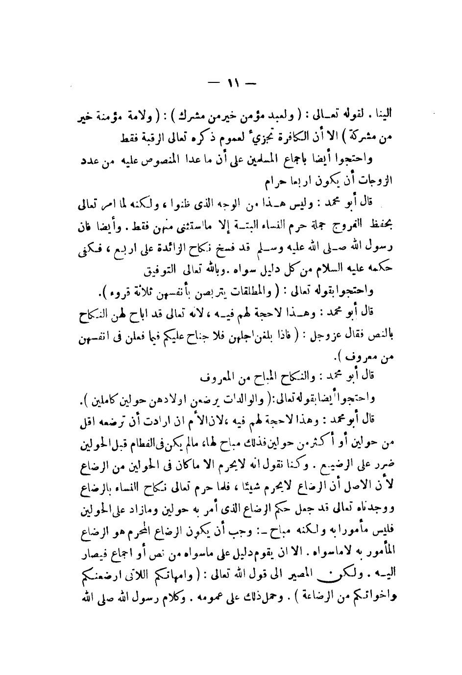 الزائدة على أربع فكفى حكمه صلى الله عليه وسلم من كل دليل سواه وبالله تعالى التوفيق واحتجوا بقوله تعالى {ولمطلقات يتربصن بأنفسهن ثلاثة قروء ولا يحل لهن أن يكتمن ما خلق لله في أرحامهن إن كن يؤمن بلله وليوم لآخر وبعولتهن أحق بردهن في ذلك إن أرادوا إصلاحا ولهن مثل لذي عليهن بلمعروف وللرجال عليهن درجة ولله عزيز حكيم} قال أبو محمد وهذا لا حجة لهم فيه لأنه تعالى قد أباح لهن النكاح بالنص فقال عز وجل {ولذين يتوفون منكم ويذرون أزواجا يتربصن بأنفسهن أربعة أشهر وعشرا فإذا بلغن أجلهن فلا جناح عليكم فيما فعلن في أنفسهن بلمعروف ولله بما تعملون خبير} قال أبو محمد والنكاح المباح من المعروف واحتجوا أيضا بقوله تعالى {ولوالدات يرضعن أولادهن حولين كاملين لمن أراد أن يتم لرضاعة وعلى لمولود له رزقهن وكسوتهن بلمعروف لا تكلف نفس إلا وسعها لا تضآر والدة بولدها ولا مولود له بولده وعلى لوارث مثل ذلك فإن أرادا فصالا عن تراض منهما وتشاور فلا جناح عليهما وإن أردتم أن تسترضعوا أولادكم فلا جناح عليكم إذا سلمتم مآ آتيتم بلمعروف وتقوا لله وعلموا أن لله بما تعملون بصير} قال أبو محمد وهذا لا حجة لهم فيه لأن الأم إن أرادت أن ترضعه أقل من حولين أو أكثر من حولين فذلك مباح لها ما لم يكن في الفطام قبل الحولين ضرر على الرضيع وكنا نقول إنه لا يحرم إلا ما كان في الحولين من الرضاع لأن الأصل أن الرضاع لا يحرم شيئا فلما حرم تعالى نكاح النساء بالرضاع ووجدناه تعالى قد جعل حكم الرضاع الذي أمر به حولين وما زاد عن الحولين فليس مأمورا ولكنه مباح وجب أن يكون الرضاع المحرم هو الرضاع المأمور به لا ما سواه إلا أن يقوم دليل على ما سواه من نص أو إجماع فيصار إليه ولكن المصير إلى قول الله تعالى {حرمت عليكم أمهاتكم وبناتكم وأخواتكم وعماتكم وخالاتكم وبنات لأخ وبنات لأخت وأمهاتكم اللاتي أرضعنكم وأخواتكم من لرضاعة وأمهات نسآئكم