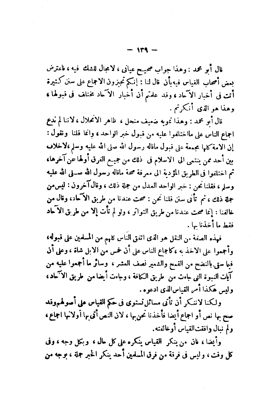 على ما اختلفوا عليه من قبول خبر الواحد وإنما قلنا ونقول إن الأمة كلها مجمعة على قبول ما قاله رسول الله صلى الله عليه وسلم لا خلاف بين أحد ممن ينتمي إلى الإسلام في ذلك من جميع الفرق أولها عن آخرها ثم اختلفوا في الطريق المؤدية إلى معرفة صحة ما قاله رسول الله صلى الله عليه وسلم فقلنا نحن خبر الواحد العدل من جملة ذلك وقال آخرون ليس من جملة ذلك ثم تأتي سنن قلنا نحن صحت عندنا من طريق من الآحاد وقال من خالفنا إنما صحت عندنا من طريق التواتر ولو لم تأت إلا من طريق الآحاد فقط ما أخذنا بها فهذه الصفة النقل هو الذي اتفق الناس كلهم من المسلمين على قبوله وأجمعوا على الأخذ به كإجماع الناس على أن في خمس من الإبل شاة وعلى أن فيما سقي بالنضح من القمح والشعير نصف العشر وسائر ما أجمعوا عليه من آيات النبوة التي جاءت من طريق الكافة وجاءت أيضا من طريق الآحاد وليس هكذا أمر القياس الذي ادعوه ولكنا لا ننكر أن تأتي مسائل تستوي في حكم القياس على أصولهم وقد صح بها نص أو إجماع أيضا فأخذنا نحن بها لأن النص أتى بها أو لأنها إجماع ولم نبال وافقت القياس أو خالفته وأيضا فإن من ينكر القياس ينكره على كل حال وبكل وجه وفي كل وقت وليس في فرقة من فرق المسلمين أحد ينكر الخبر جملة بوجه من
