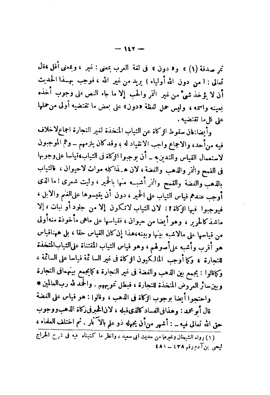 تمر صدقة ودون في لغة العرب بمعنى غير وبمعنى أقل قال تعالى {من ورآئهم جهنم ولا يغني عنهم ما كسبوا شيئا ولا ما تخذوا من دون لله أوليآء ولهم عذاب عظيم} يريد من غير الله فوجب بهذا الحديث أن لا يؤخذ شيء من غير التمر والحب إلا ما جاء النص على وجوب أخذه بعينه واسمه وليس حمل لفظه دون على بعض ما تقتضيه أولى من حملها على كل ما تقتضيه وأيضا فإن سقوط الزكاة عن الثياب المتخذة لغير التجارة إجماع لا خلاف فيه من أحد والإجماع الانقياد وكان يلزمهم وهو الموجبون لاستعمال القياس والتدين به أن يوجبوا الزكاة في الثياب قياسا على وجوبها في القمح والتمر والذهب والفضة لأن هذا كله موات لا حيوان فالثياب بالذهب والفضة والقمح والتمر أشبه منها بالحمير وليت شعري ما الذي أوجب عندهم قياس الثياب على الحمير دون أن يقيسوها على الغنم والإبل فيوجبوا فيها الزكاة لأن الثياب لا تكون إلا من جلود أو نبات إلا من شذ كالحرير وهو أيضا من حيوان فقياسها على ما هي مأخوذة منه أولى من قياسها على ما لا شبه بينها وبينه هذا إن كان القياس حقا بل ههنا قياس هو أقرب وأشبه على أصولهم وهو قياس المنتقاة على الثياب المتخذة للتجارة وكما أوجب المالكيون الزكاة في غير السائمة قياسا على السائمة وكما قالوا يجمع بين الذهب والفضة في غير التجارة كما يجمع بينهما في التجارة وبين سائر العروض المتخذة للتجارة فبطل تمويههم والحمد لله رب العالمين واحتجوا أيضا بوجوب الزكاة في الذهب وقالوا هو قياس على الفضة قال أبو محمد وهذا في