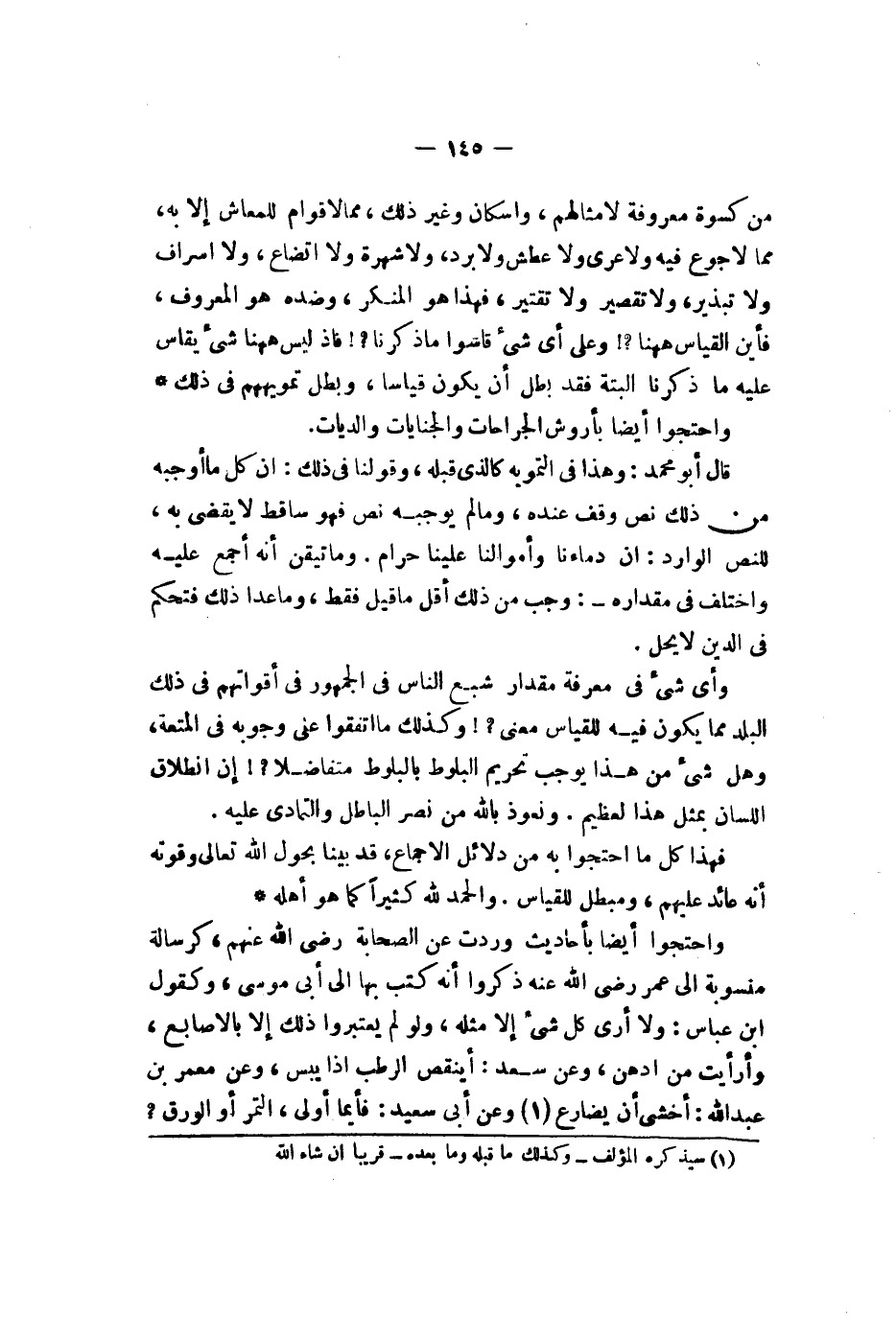 فيه للقياس معنى وكذلك ما اتفقوا على وجوبه في المتعة وهل شيء من هذا يوجب تحريم البلوط بالبلوط متفاضلا إن انطلاق اللسان بمثل هذا لعظيم ونعوذ بالله من نصر الباطل والتمادي عليه فهذا كل ما احتجوا به من دلائل الإجماع فقد بينا بحول الله وقوته أنه عائد عليهم ومبطل للقياس والحمد لله كثيرا كما هو أهله واحتجوا أيضا بأحاديث وردت عن الصحابة رضي الله عنهم كرسالة منسوبة إلى عمر رضي الله عنه ذكروا أنه كتب بها إلى أبي موسى وكقول ابن عباس ولا أرى كل شيء إلا مثله ولو لم يعتبروا ذلك إلا بالأصابع أرأيت من ادهن وعن سعد أينقض الرطب إذا يبس وعن معمر بن عبد الله أخشى أن يضارع وعن أبي سعيد فأيما أولى التمر أو الورق