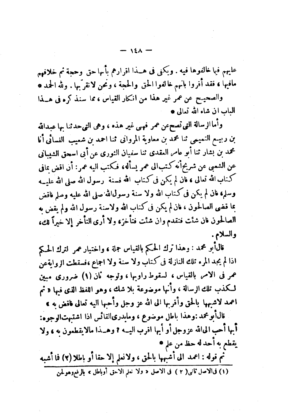والصحيح عن عمر غير هذا من إنكار القياس مما سنذكره في هذا الباب إن شاء الله تعالى وأما الرسالة التي تصح عن عمر فهي غير هذه وهي التي حدثنا بها عبد الله بن ربيع التميمي نا محمد بن معاوية المرواني نا أحمد بن شعيب النسائي نا محمد بن بشار نا أبو عامر العقدي نا سفيان الثوري عن أبي إسحاق الشيباني عن الشعبي عن شريح أنه كتب إلى عمر يسأله فكتب إليه عمر أن اقض بما في كتاب الله تعالى فإن لم يكن في كتاب الله فسنة رسول الله صلى الله عليه وسلم فإن لم يكن في كتاب الله ولا في سنة رسول الله صلى الله عليه وسلم فاقض بما قضى الصالحون فإن لم يكن في كتاب الله ولا في سنة رسول الله ولم يقض به الصالحون فإن شئت فتقدم وإن شئت فتأخر ولا أرى التأخر إلا خيرا لك والسلام قال أبو محمد وهذا ترك الحكم بالقياس جملة واختيار عمر لترك الحكم إذا لم يجد المرء تلك النازلة في كتاب ولا سنة ولا إجماع فسقطت الرواية عن عمر في الأمر بالقياس لسقوط راويها ولوجه ثان ضروري مبين لكذب تلك الرسالة وأنها موضوعة بلا شك وهو اللفظ الذي فيها ثم اعمد لأشبهها بالحق وأقربها إلى الله عز وجل وأحبها إليه تعالى فاقض به قال أبو محمد وهذا باطل موضوع وما يدري القايس إذا شبهت الوجوه أيها أحب إلى الله عز وجل أو أيها أقرب إليه وهذا ما يقطعون به ولا يقطع به أحد له حظ من علم ثم قوله اعمد إلى أشبهها بالحق ولا نعلم إلا حقا أو باطلا فما أشبه